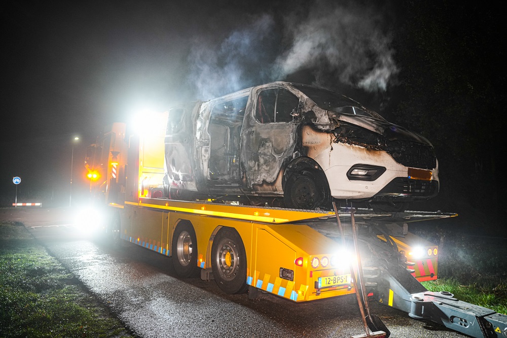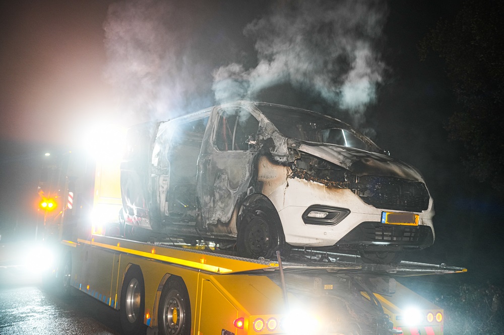 Bij aankomst van de brandweer stond het voertuig al volledig in brand. De bestelbus brandde volledig uit; alleen het karkas bleef over.
