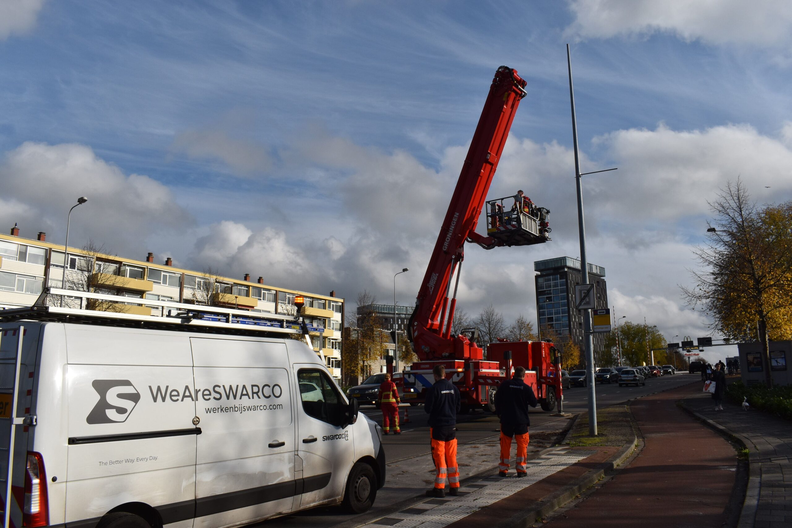 GRONINGEN – Op de Europaweg in Groningen is zondagmiddag schade ontstaan door de storm. De arm van een lantaarnpaal brak af en hing los, waardoor er gevaar was dat deze naar beneden zou vallen.