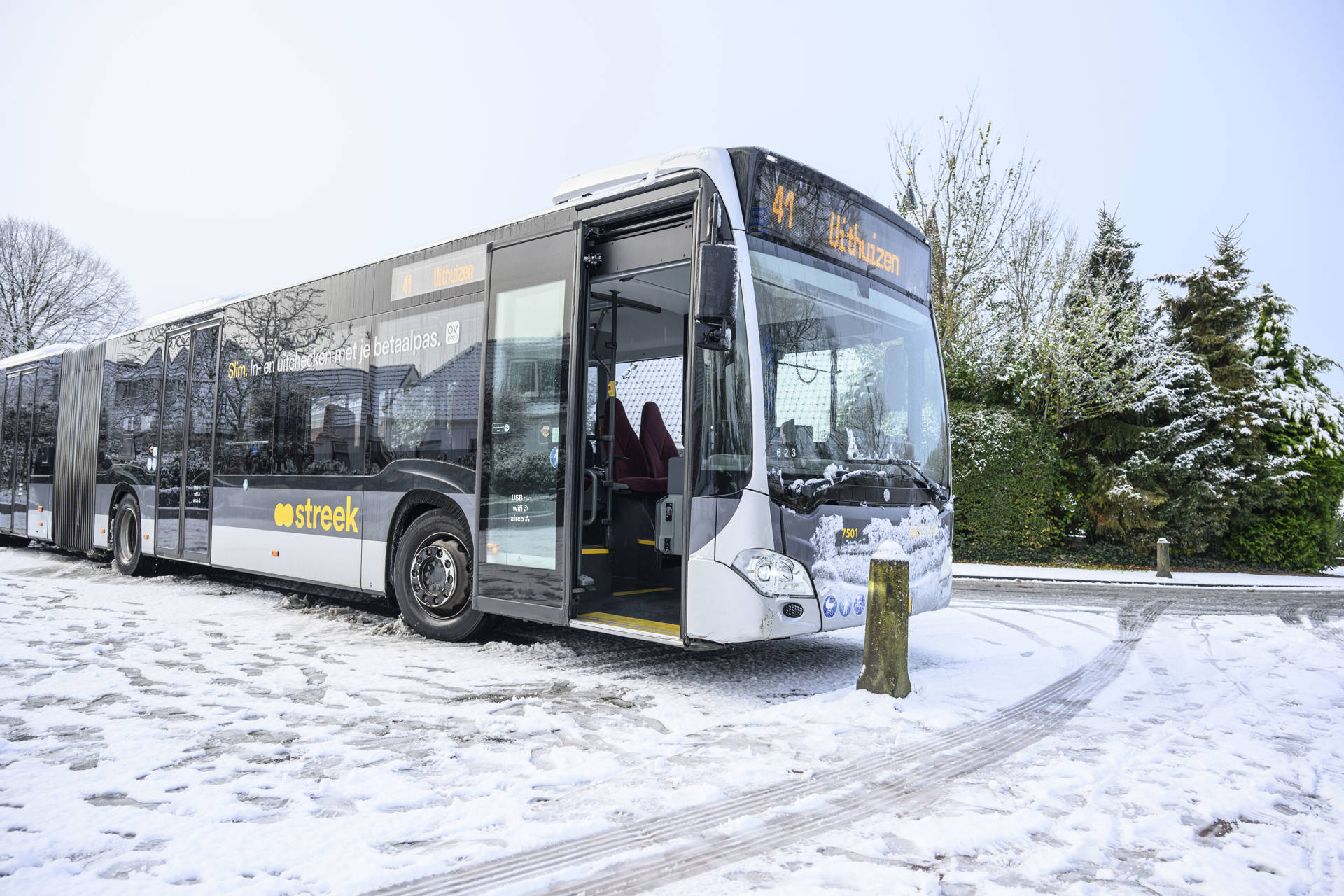 Lijnbus glijdt door en mist de bocht in tegen paaltje