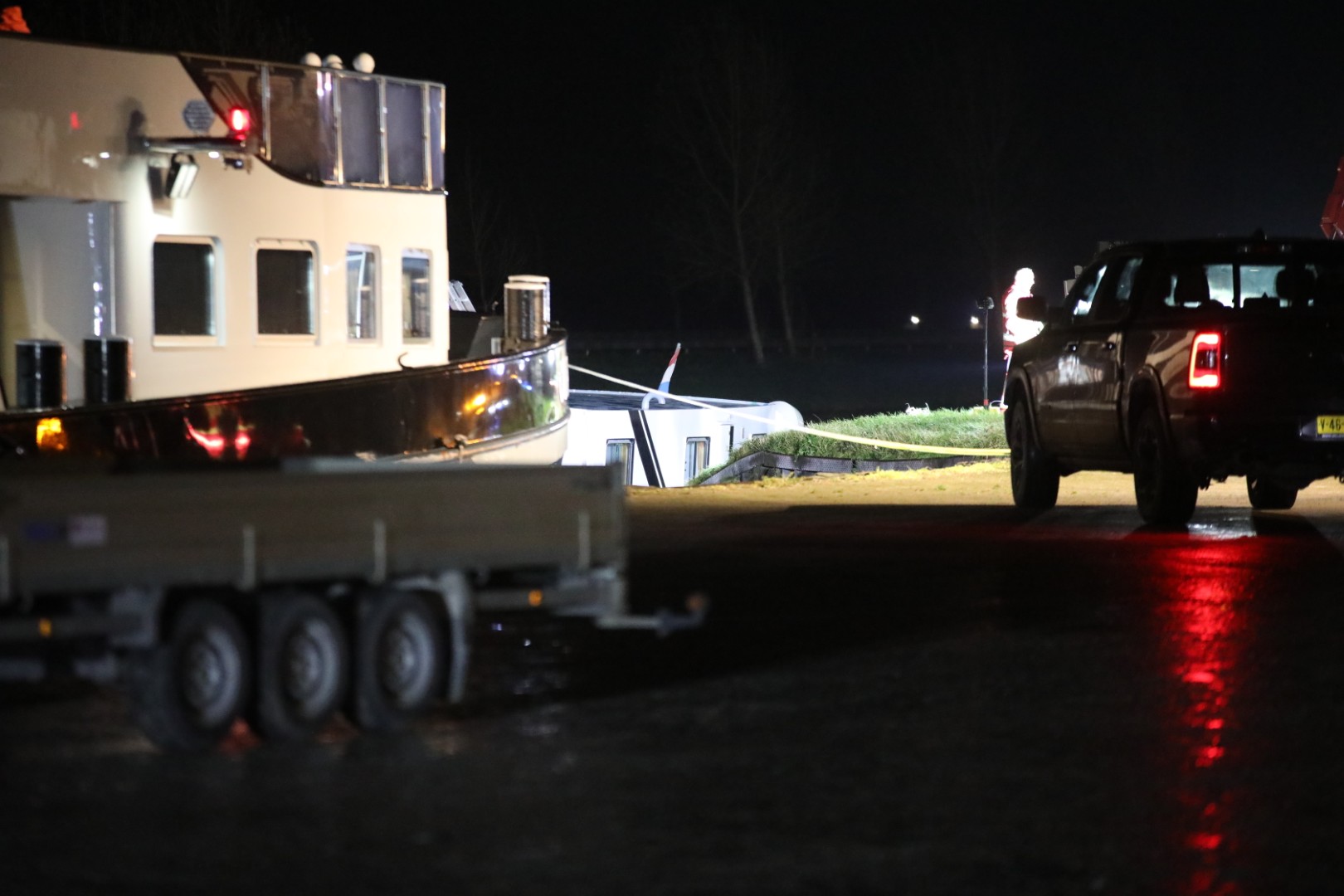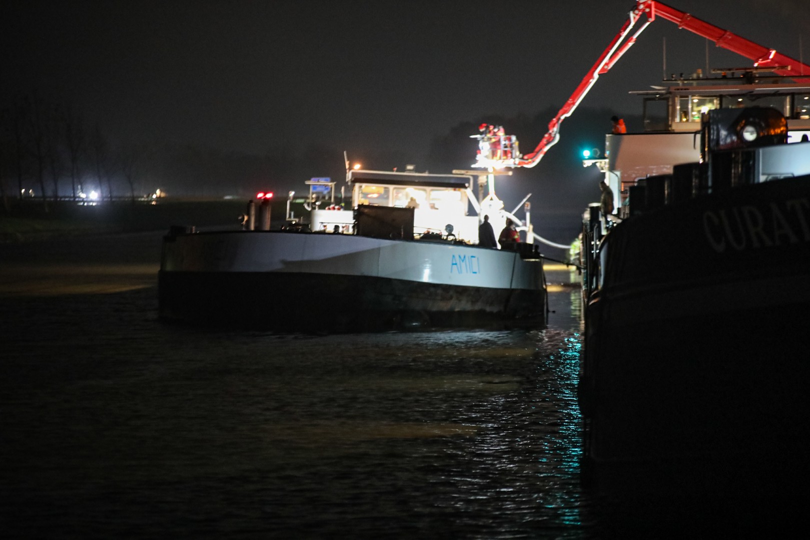 Door het binnenstromende water kwam de tanker scheef te liggen en raakte vast op de bodem. De brandweer pompt het water weg om het schip los te krijgen. Het ruim met vloeibare mest staat nog niet onder water. Meerdere brandweereenheden zijn ter plaatse en houden de situatie nauwlettend in de gaten.