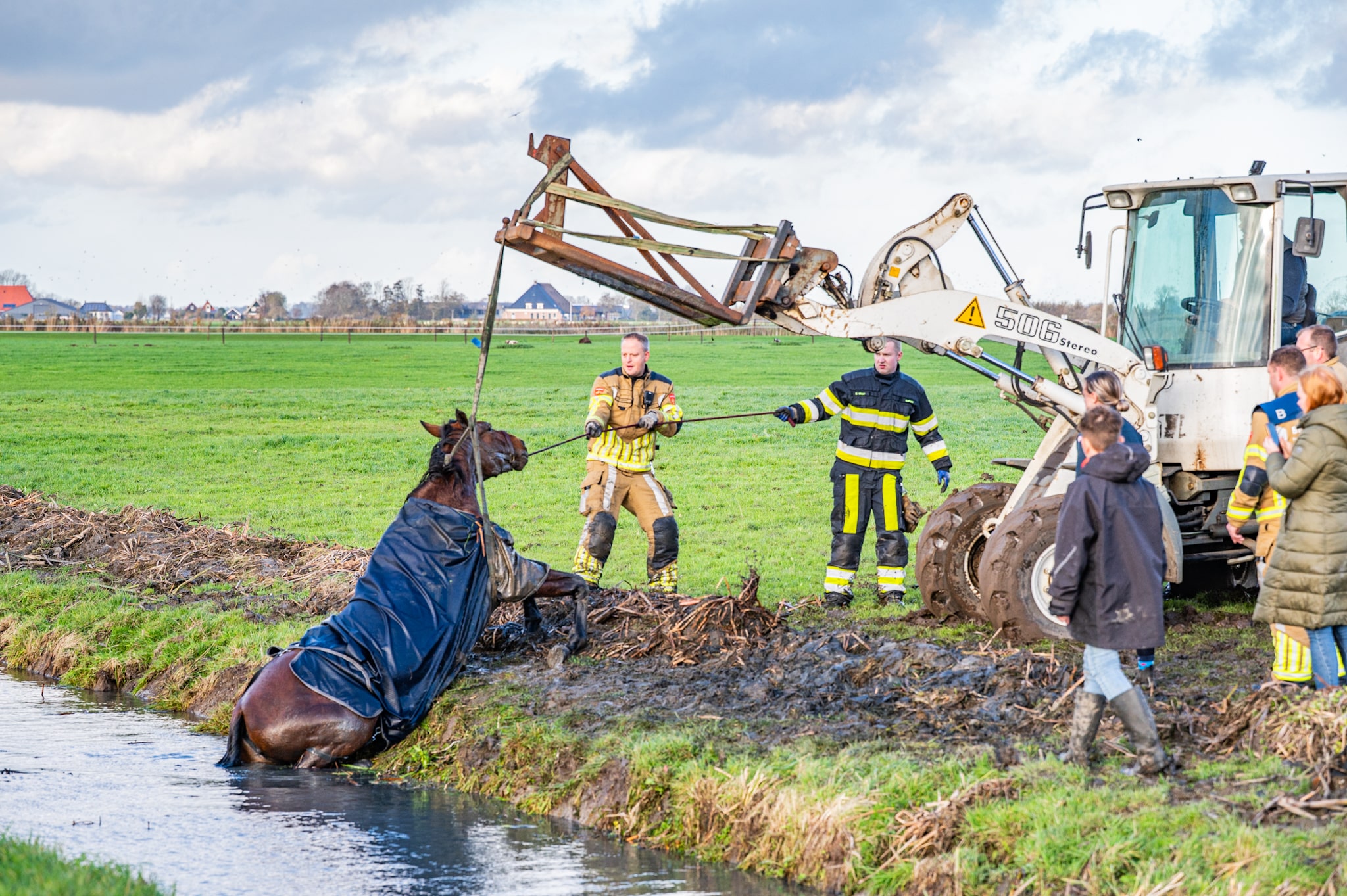 Rond het middaguur werd geprobeerd het paard met brandslangen uit het water te trekken, maar dit bleek niet voldoende. Uiteindelijk werd een shovel ingezet om het dier op het droge te krijgen. Het paard lag uitgeput aan de kant en had tijd nodig om bij te komen van de inspanning.