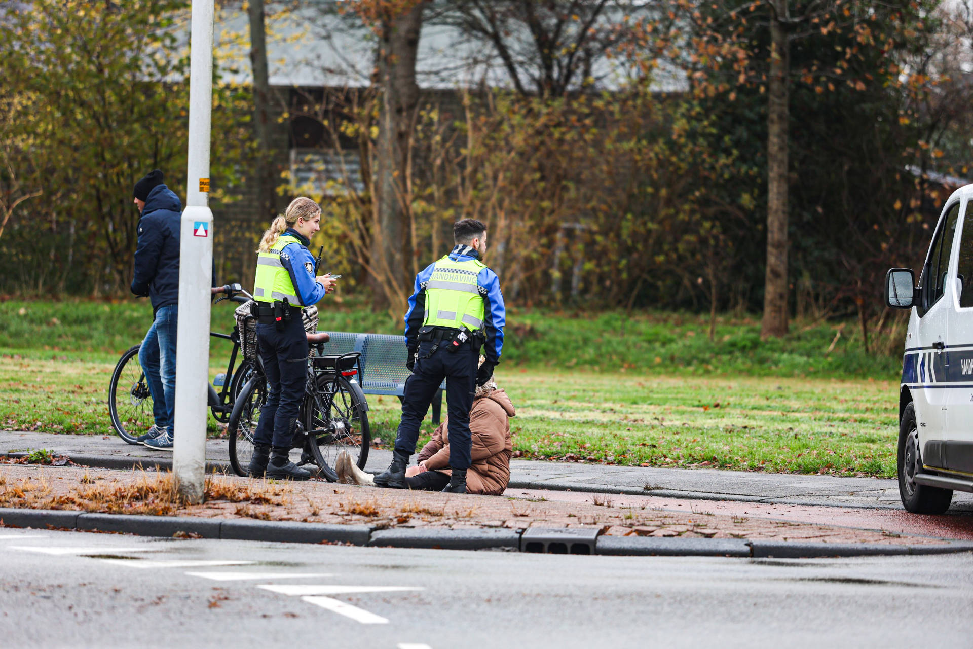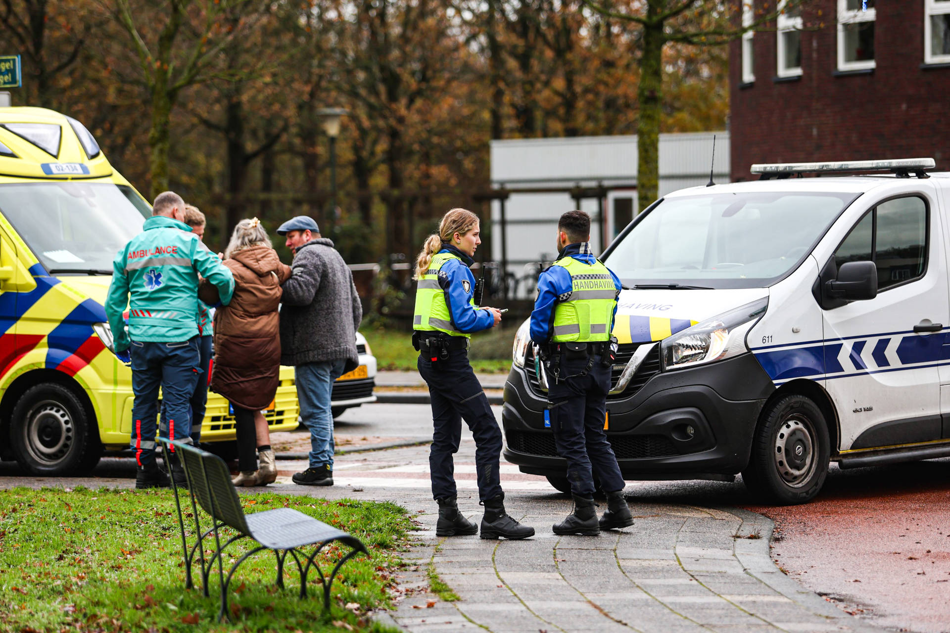 Een vrouw raakte gewond aan haar knie en is behandeld door ambulancepersoneel. De gemeente is bezig met het reinigen van de weg en het strooien van absorptiekorrels om verdere incidenten te voorkomen.