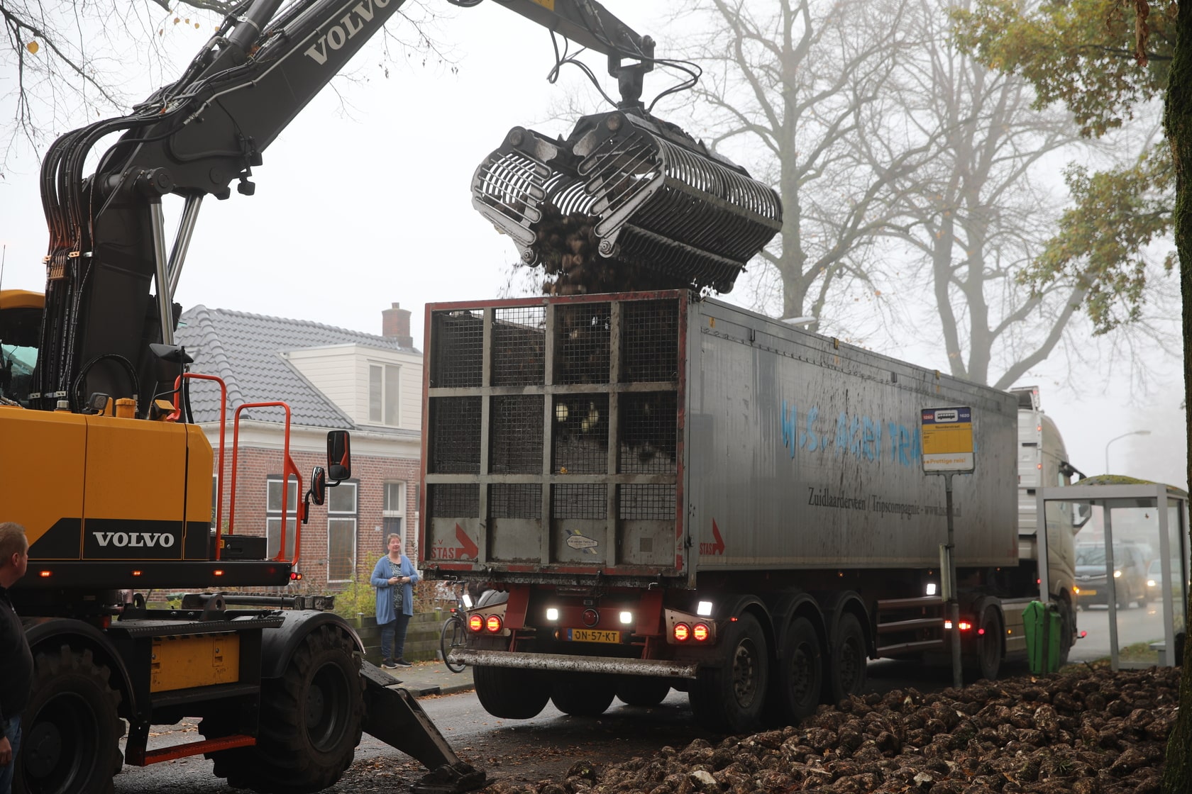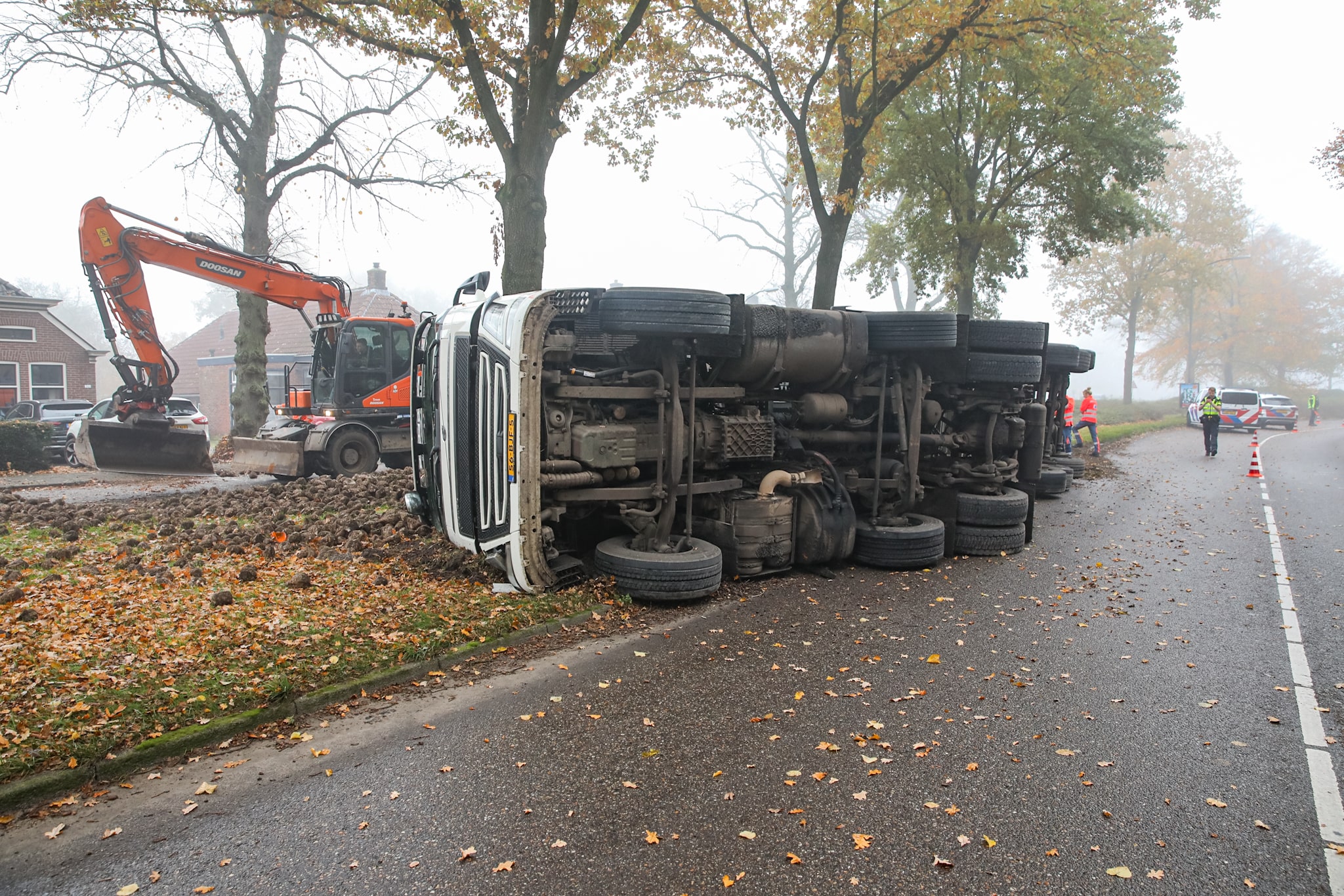 Vrachtauto met suikerbieten kantelt midden op de weg
