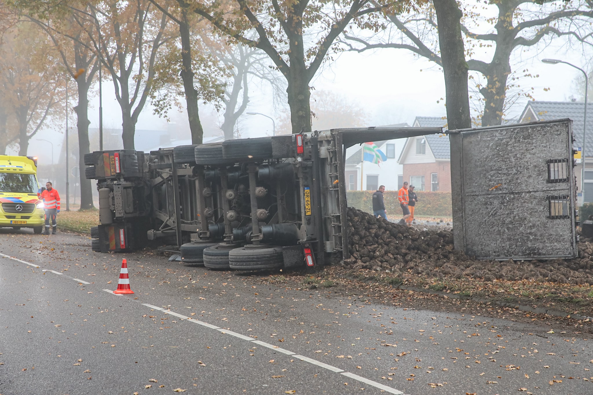 Het ongeval gebeurde in een flauwe bocht, waar de vrachtwagen met een wiel op de stoep terechtkwam en vervolgens kantelde. Een deel van de lading suikerbieten belandde op de weg. Omwonenden en agrariërs schoten direct te hulp en hielpen met het opruimen, zodat het verkeer gedeeltelijk kon blijven doorrijden.