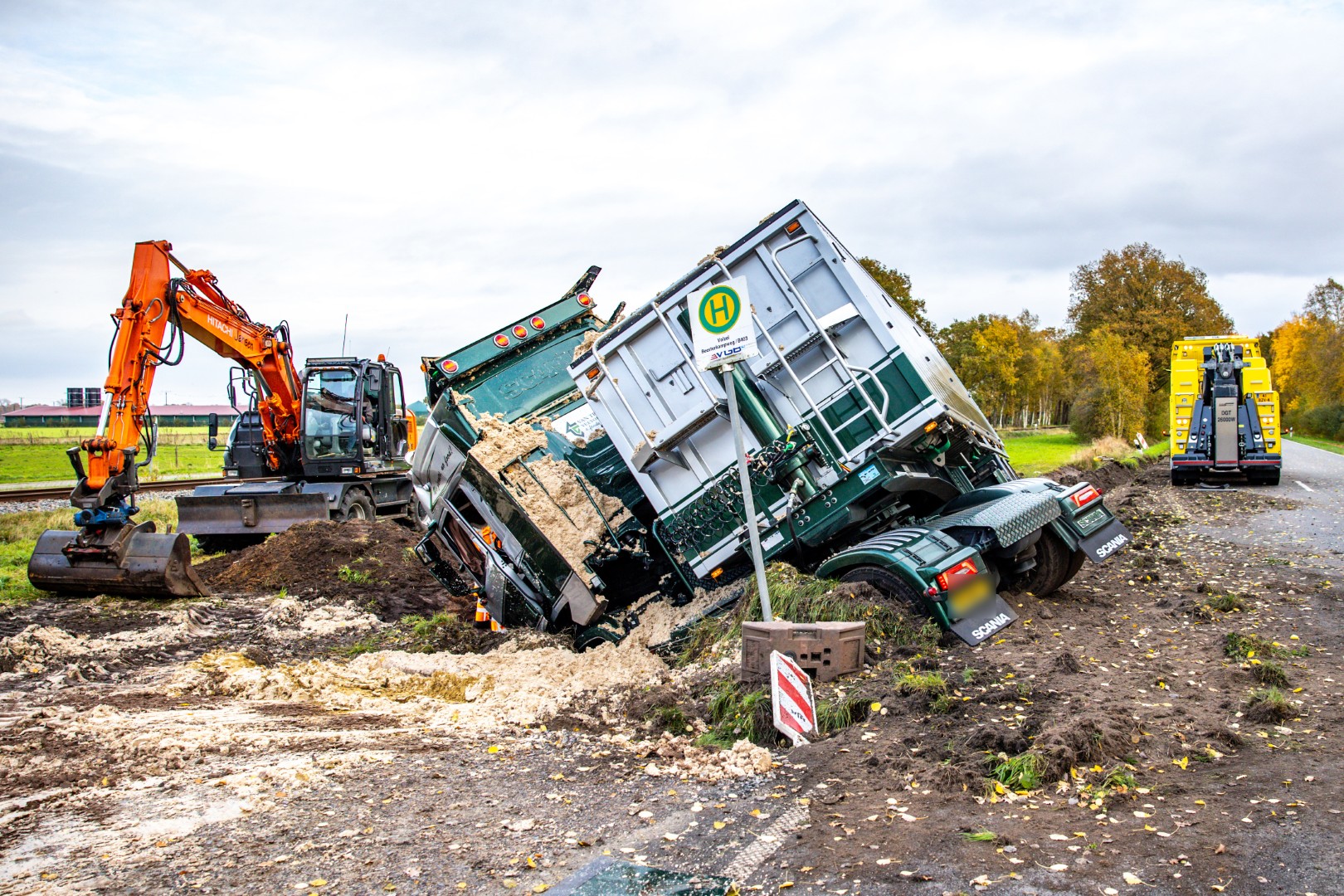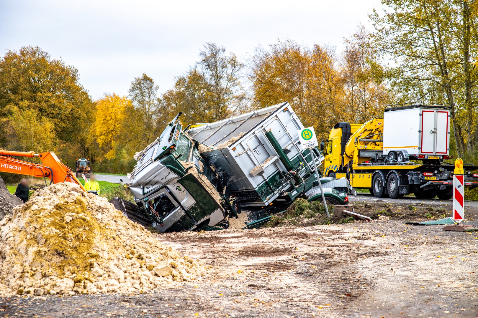 De vrachtwagen vervoerde zand, waarvan een groot deel in de berm belandde. Een Nederlands bergingsbedrijf is ter plaatse gekomen om het voertuig weg te slepen. Om het zand deels te verwijderen en de vrachtwagen los te krijgen uit de zachte ondergrond, is ook een graafmachine ingezet. De bergingswerkzaamheden zullen vermoedelijk nog enkele uren duren.