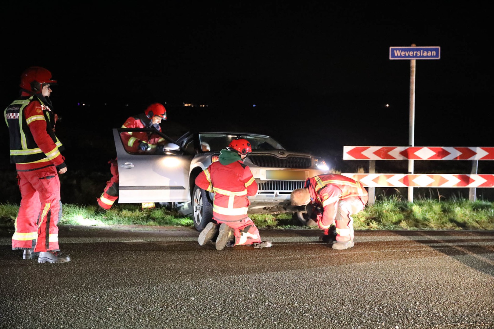 In het voertuig zaten twee oudere personen. De brandweer heeft de auto gestabiliseerd om verder wegzakken te voorkomen en assisteerde de inzittenden bij het verlaten van het voertuig. Niemand raakte gewond.