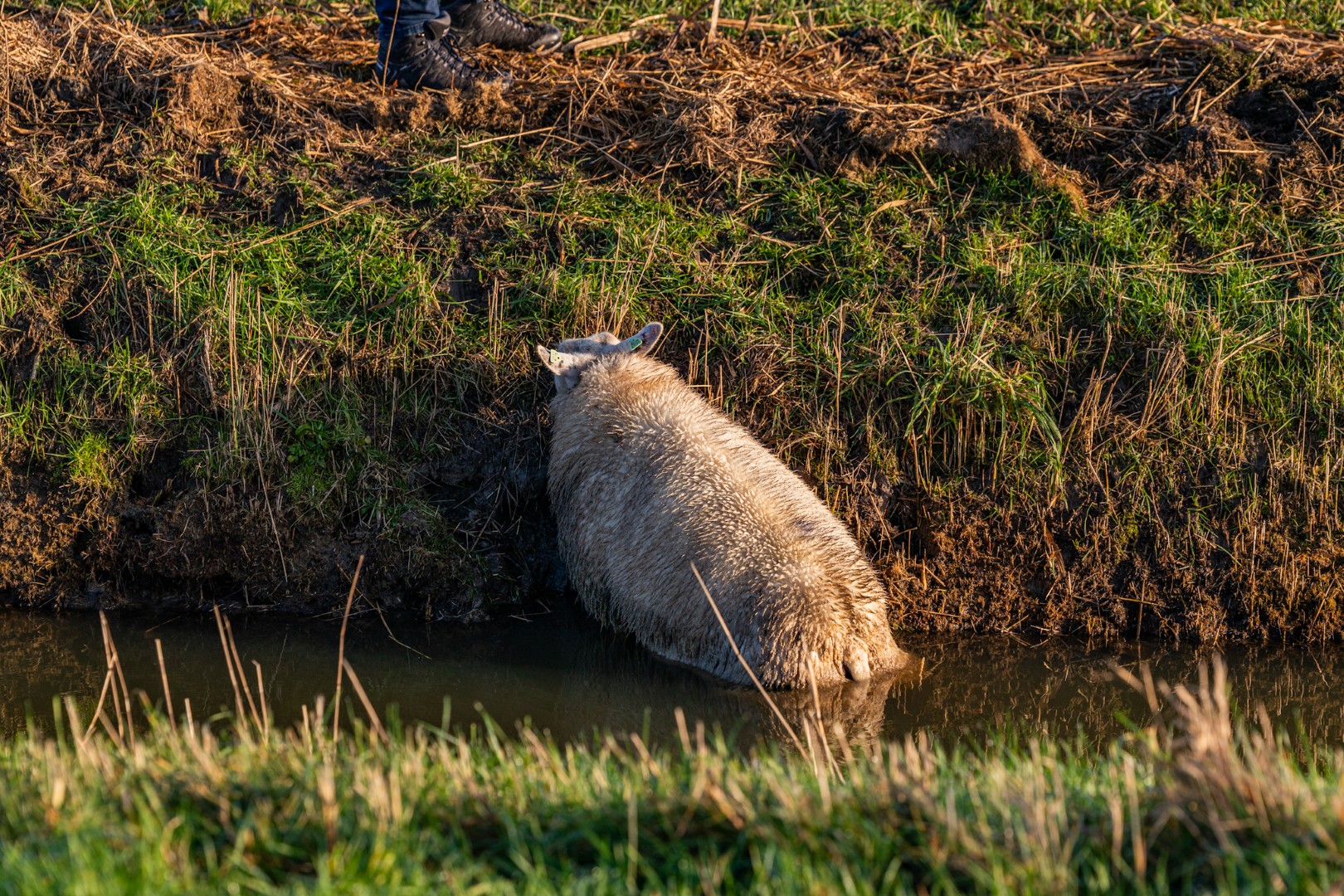 De melding kwam binnen in de ochtenduren. Twee brandweermannen wisten het schaap met behulp van touwen uit het water te trekken.