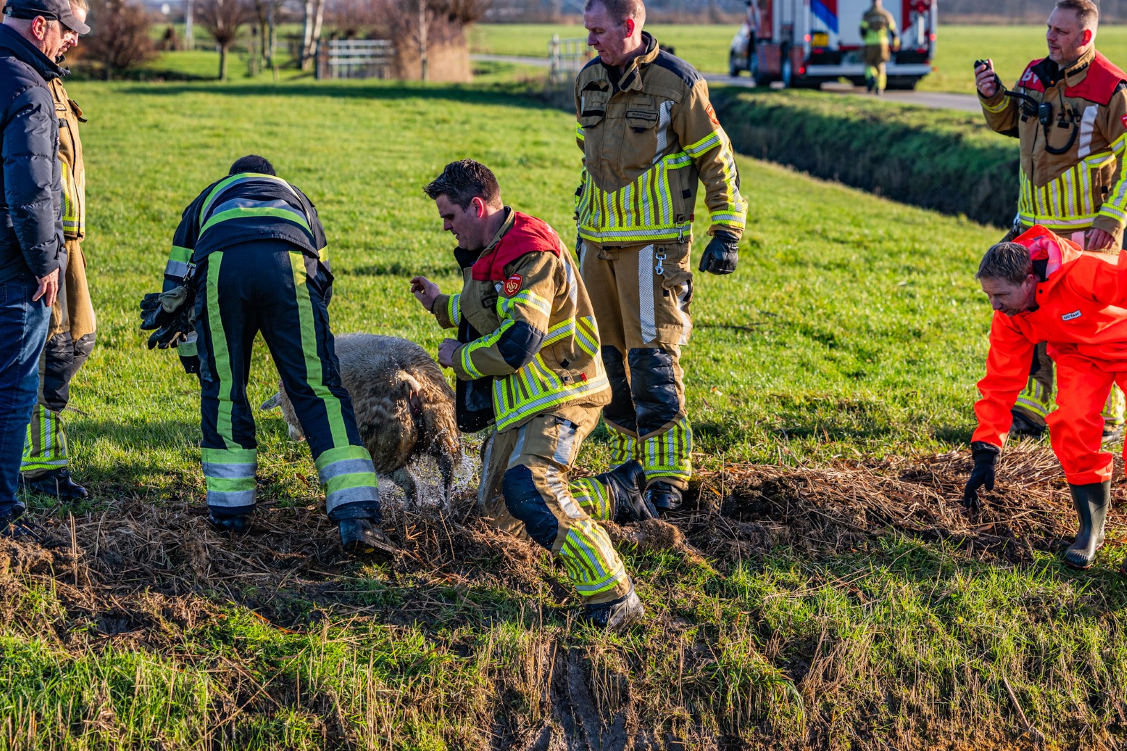 De melding kwam binnen in de ochtenduren. Twee brandweermannen wisten het schaap met behulp van touwen uit het water te trekken.