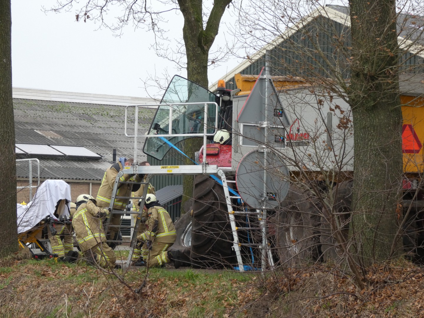 De melding kwam rond 11.15 uur binnen. Politie en ambulance waren snel ter plaatse, waarna ook de brandweer werd opgeroepen. Bij aankomst bleek de bestuurder vast te zitten in de cabine van het voertuig. De brandweer heeft een speciale brug geplaatst om op gelijke hoogte te komen met de cabine en slaagde erin de bestuurder te bevrijden.
