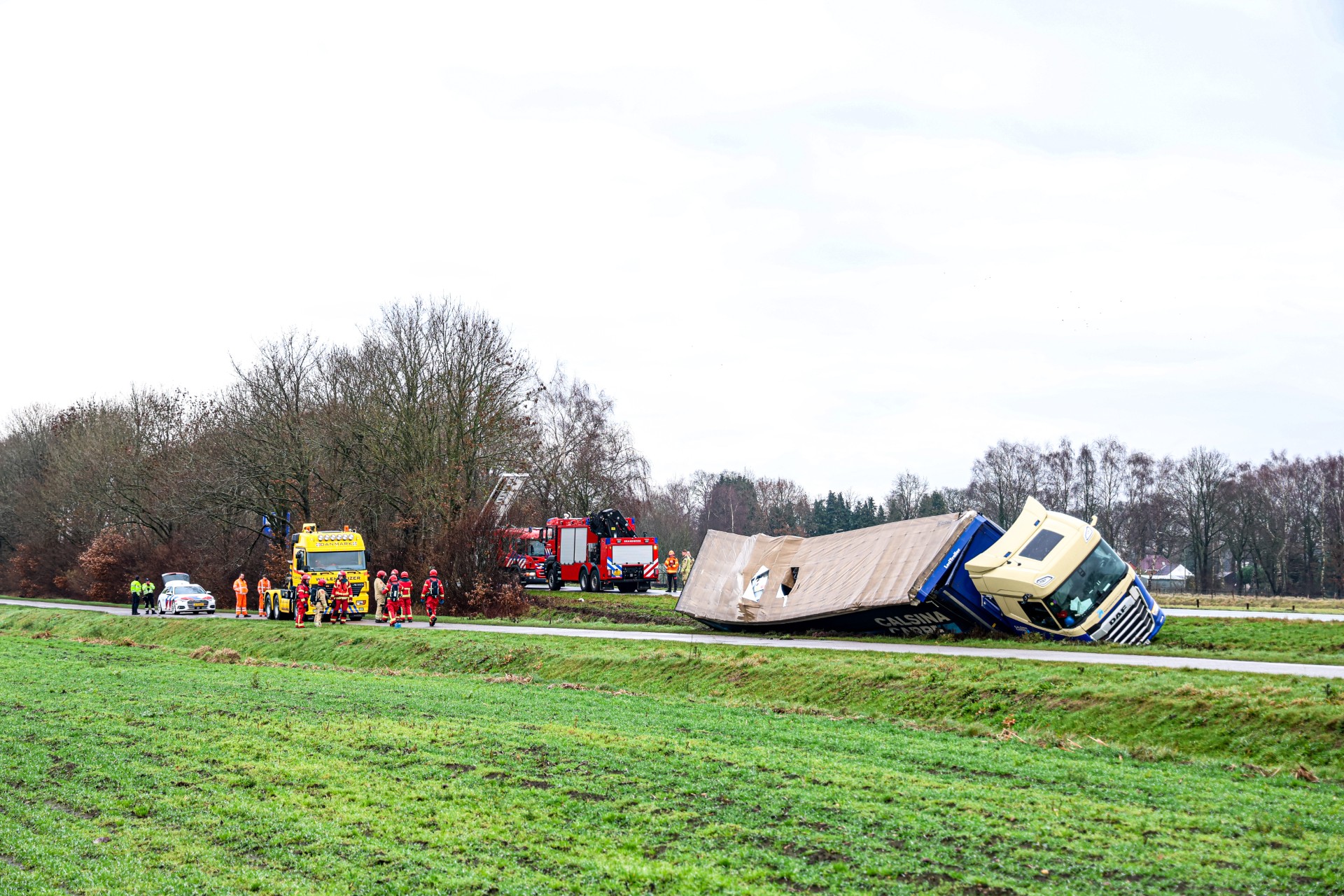 UPDATE: Vrachtwagen raakt van de weg en kantelt in greppel