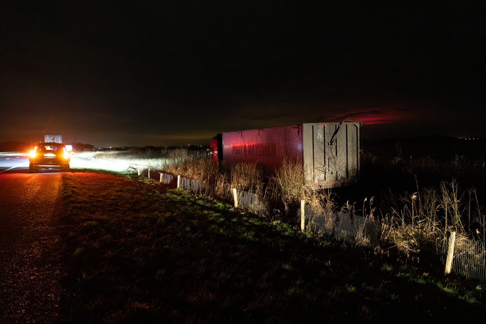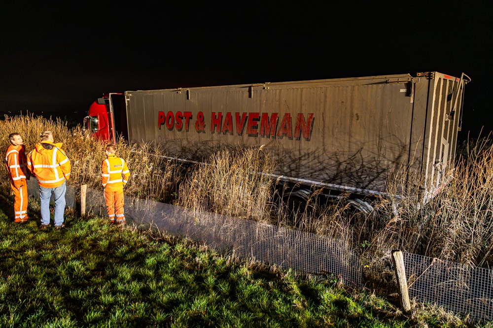De vrachtwagencombinatie raakte van de weg en kwam tot stilstand in de berm, net voor het water. De chauffeur bleef ongedeerd. De politie kwam ter plaatse en legde het voorval vast.