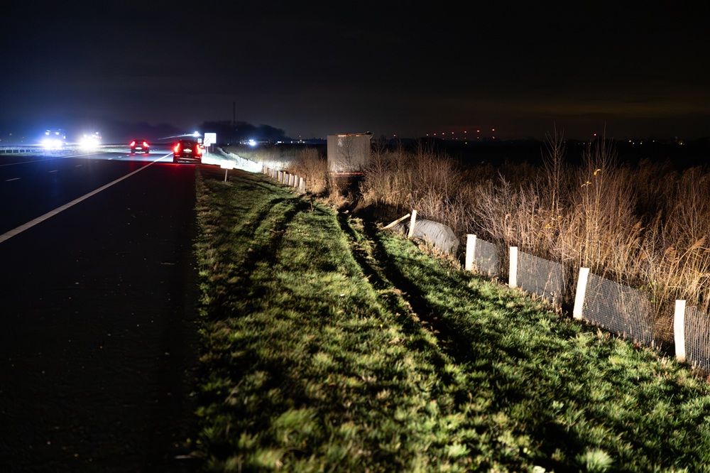 De vrachtwagencombinatie raakte van de weg en kwam tot stilstand in de berm, net voor het water. De chauffeur bleef ongedeerd. De politie kwam ter plaatse en legde het voorval vast.