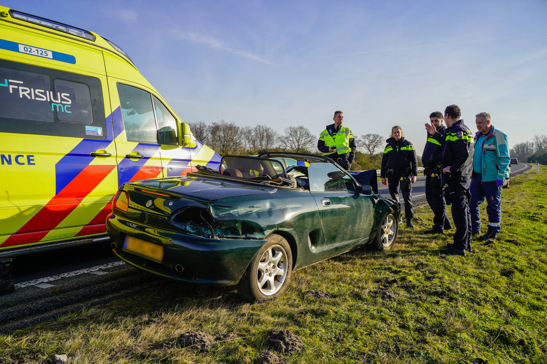 Cabrio botst tegen vangrail, bestuurder onderzocht door ambulance