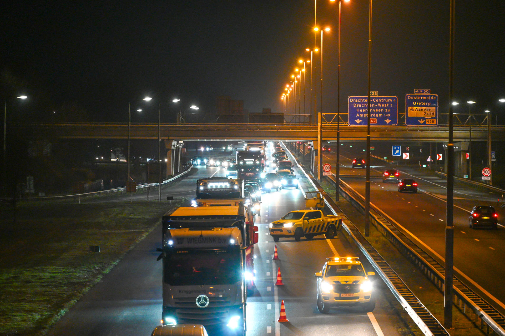 Volgens Rijkswaterstaat blijft de snelweg waarschijnlijk tot 20.00 uur grotendeels afgesloten. Rond het klaverblad Drachten ontstonden lange files en vertragingen. De politie doet onderzoek naar de toedracht van het ongeval.