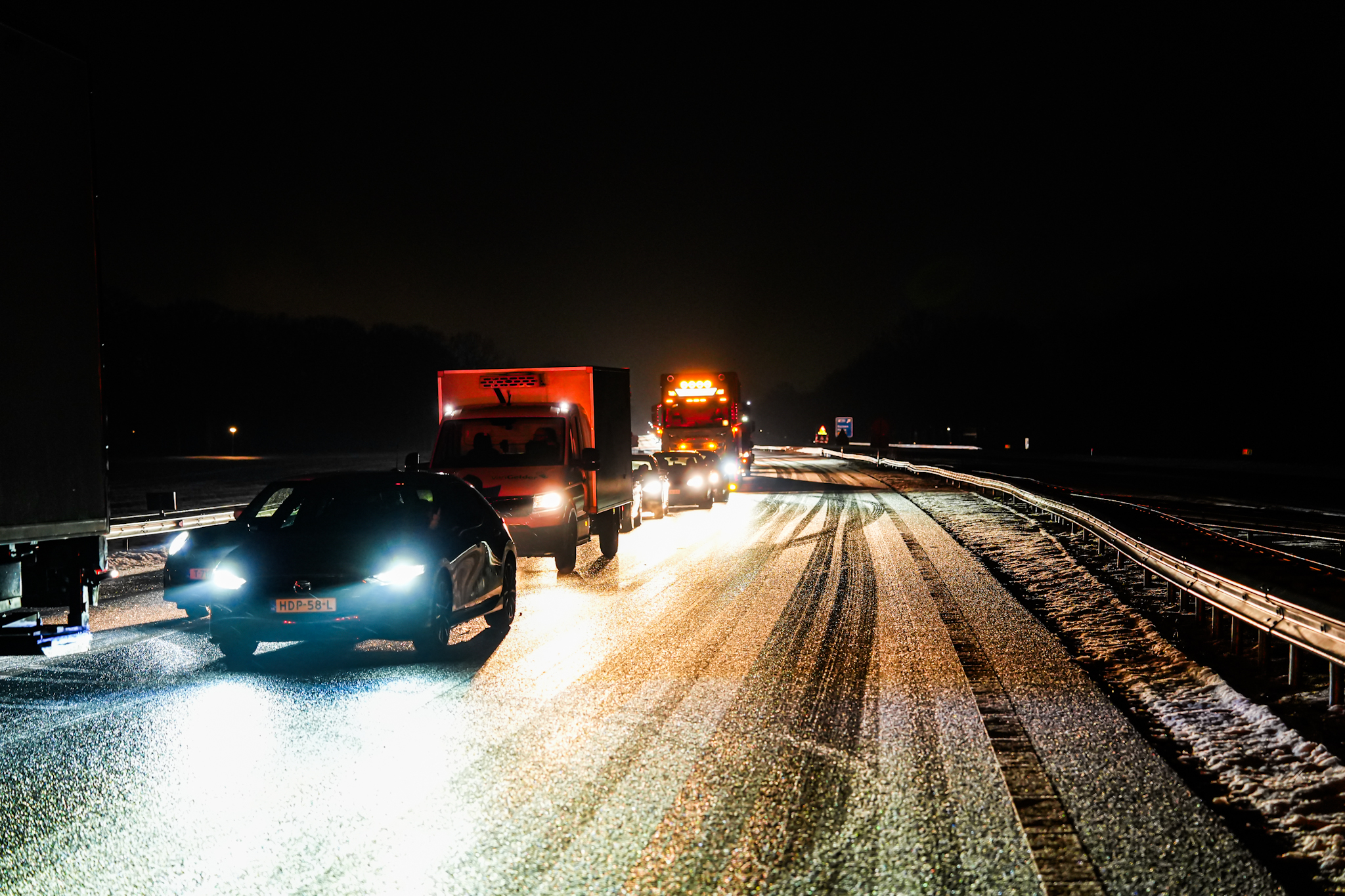 De vrachtwagen raakte in een slip, draaide 180 graden en kwam tegen de rijrichting in tot stilstand. Hierdoor raakte de volledige A28 geblokkeerd en afgesloten, wat in de vroege ochtend voor flinke files zorgde.