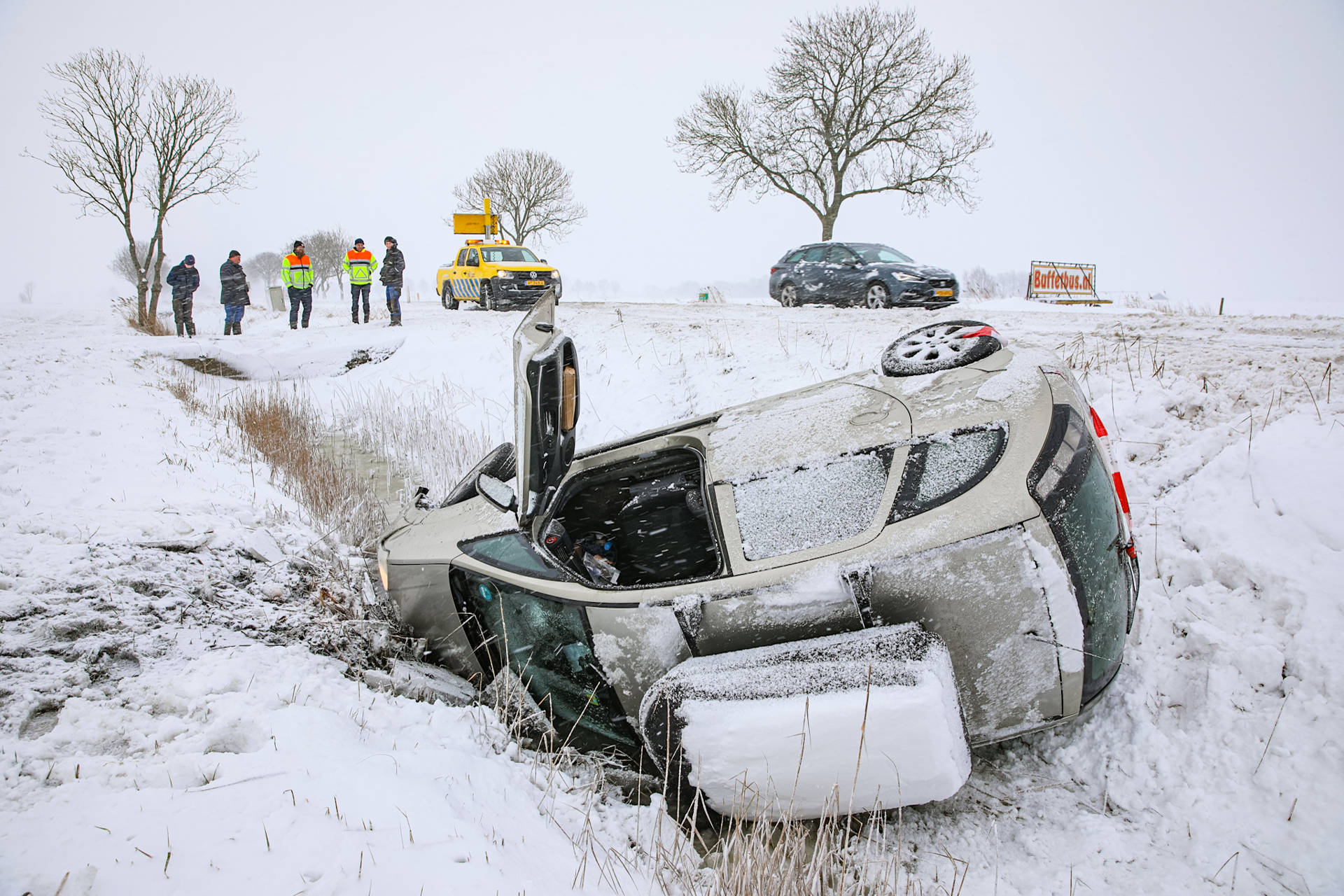 Geplaatst op 7 januari 2026, om 18:00 uurNOORDHORN – Woensdagmiddag rond 13.19 uur is op de Rijksstraatweg (N355) bij Noordhorn een auto door gladheid van de weg geraakt en op zijn zijkant in een sloot beland, ter hoogte van hectometerpaal 40,2.