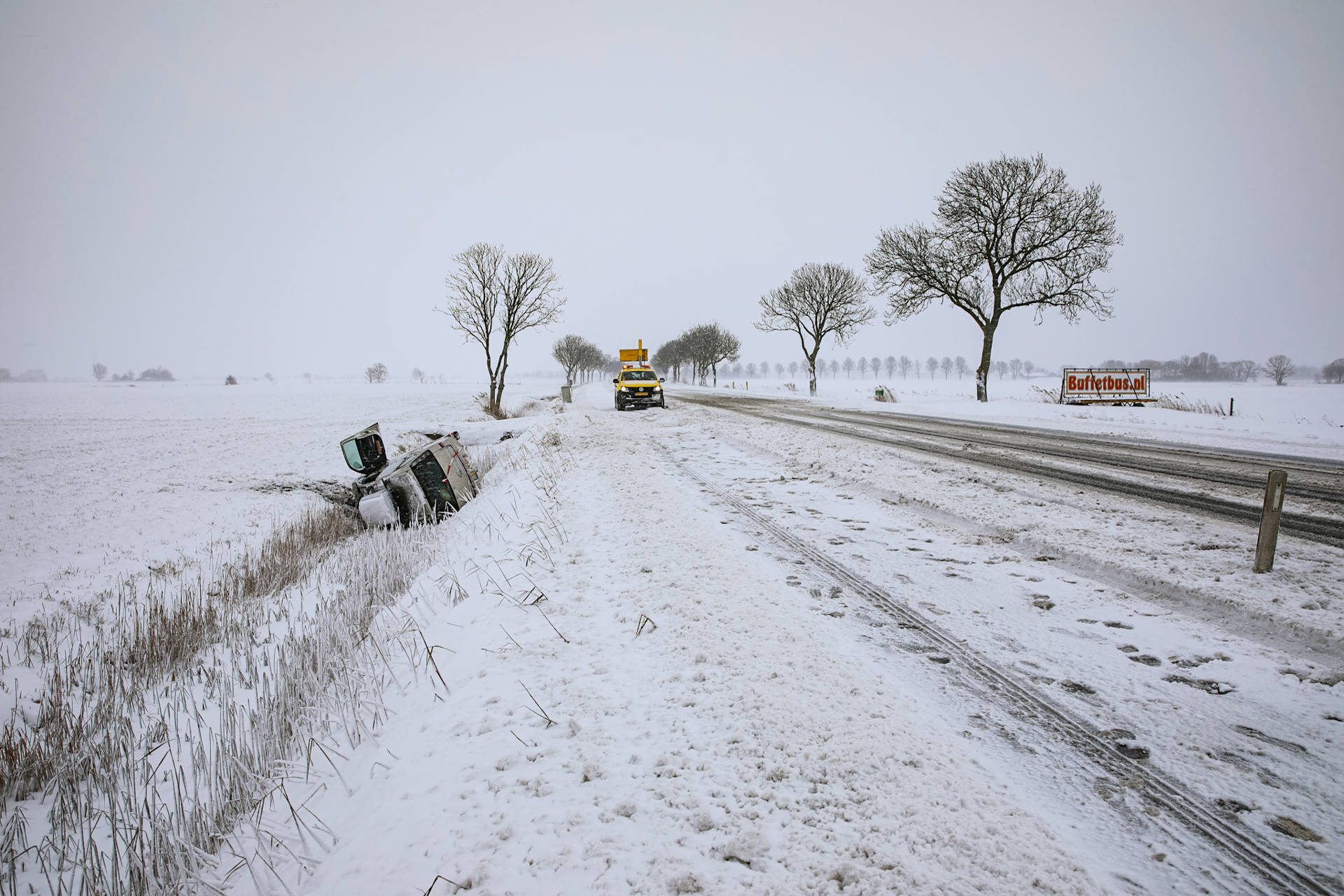De bestuurder verloor de controle over het voertuig tijdens sneeuwval en gleed van de weg. Hulpdiensten kwamen ter plaatse om assistentie te verlenen. Bij het incident raakte niemand gewond.