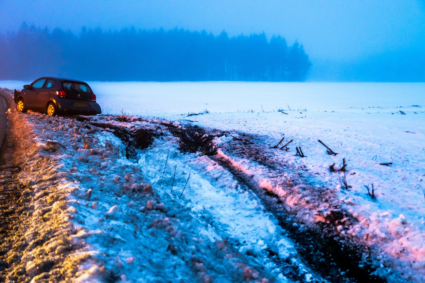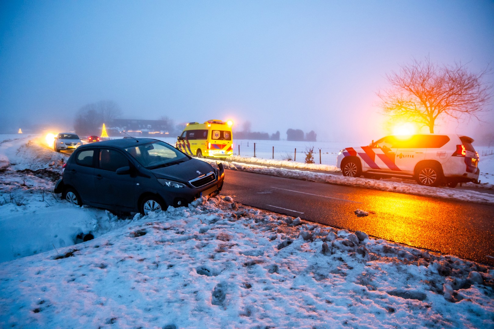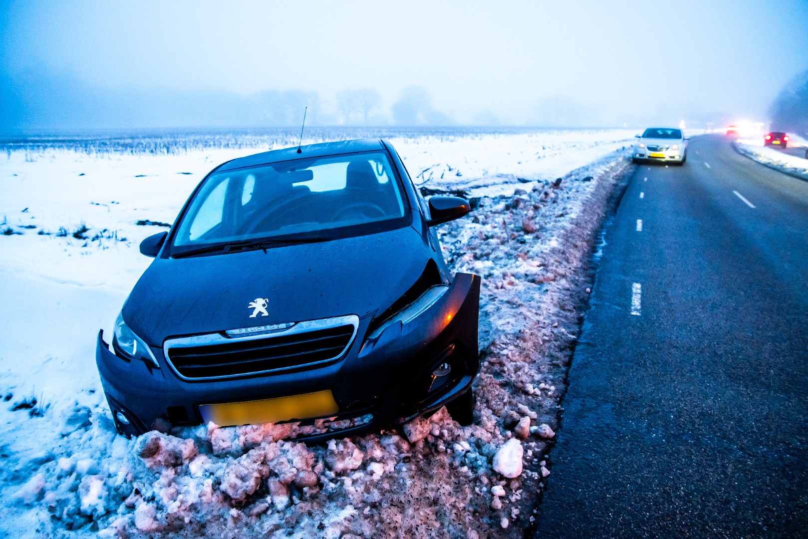 Auto raakt van weg en belandt in berm onder mistige omstandigheden