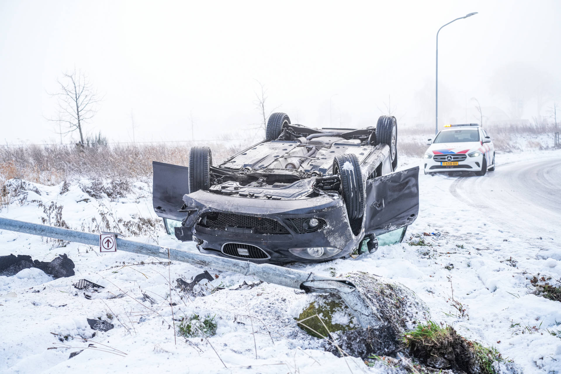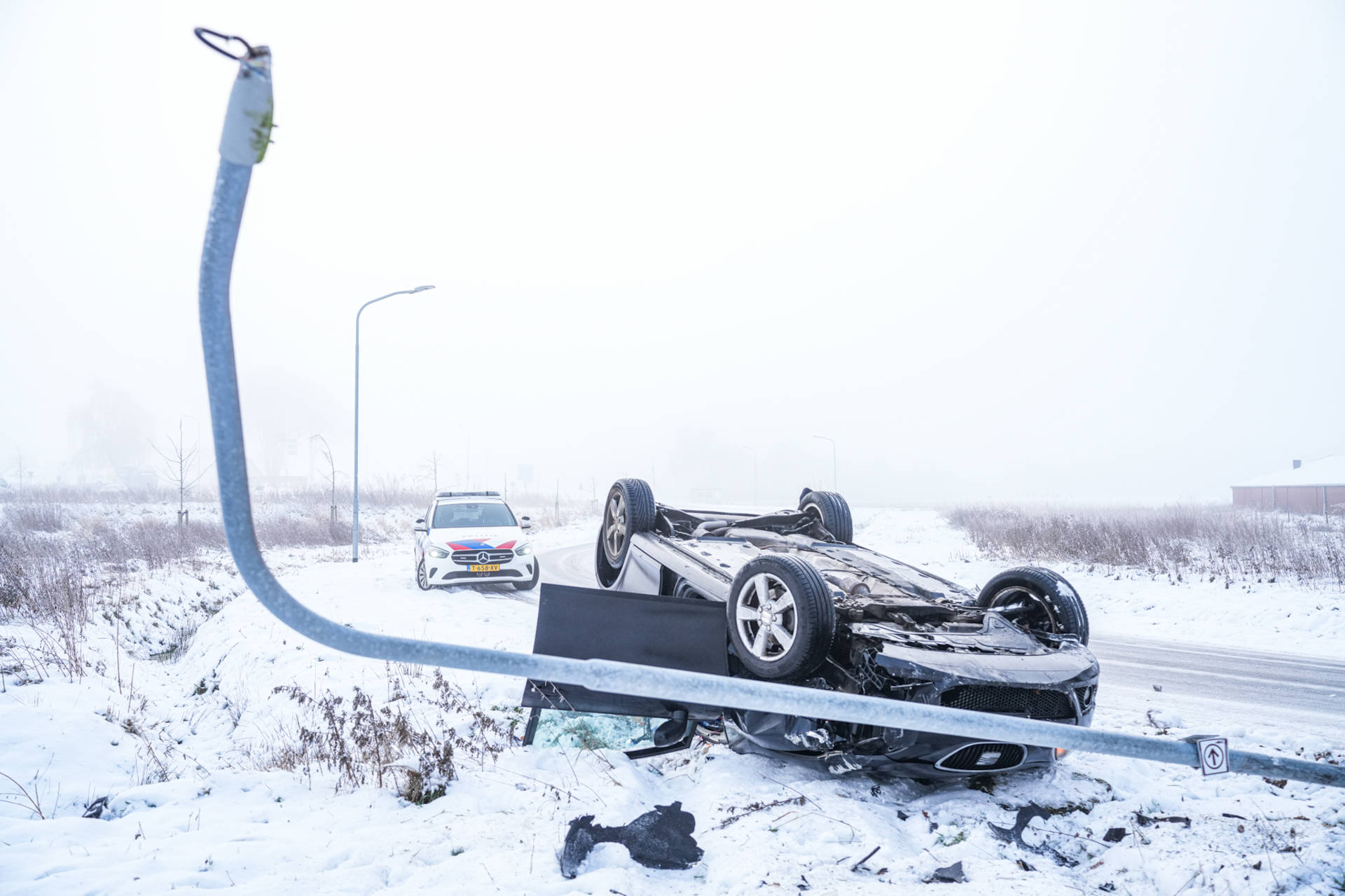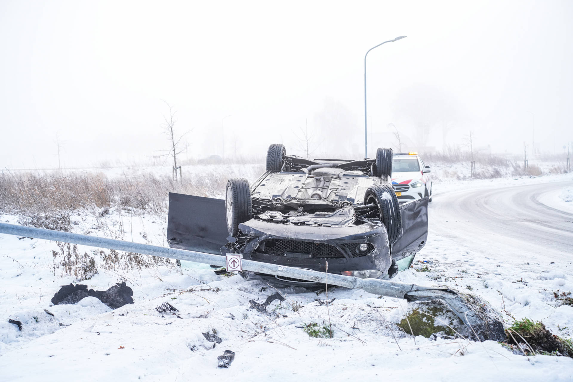 De auto kwam uiteindelijk op zijn dak tot stilstand en ontwortelde daarbij een lantaarnpaal. Ondanks de flinke schade raakte niemand gewond. De weg was tijdelijk minder goed begaanbaar door het incident en de beschadigde lantaarnpaal.