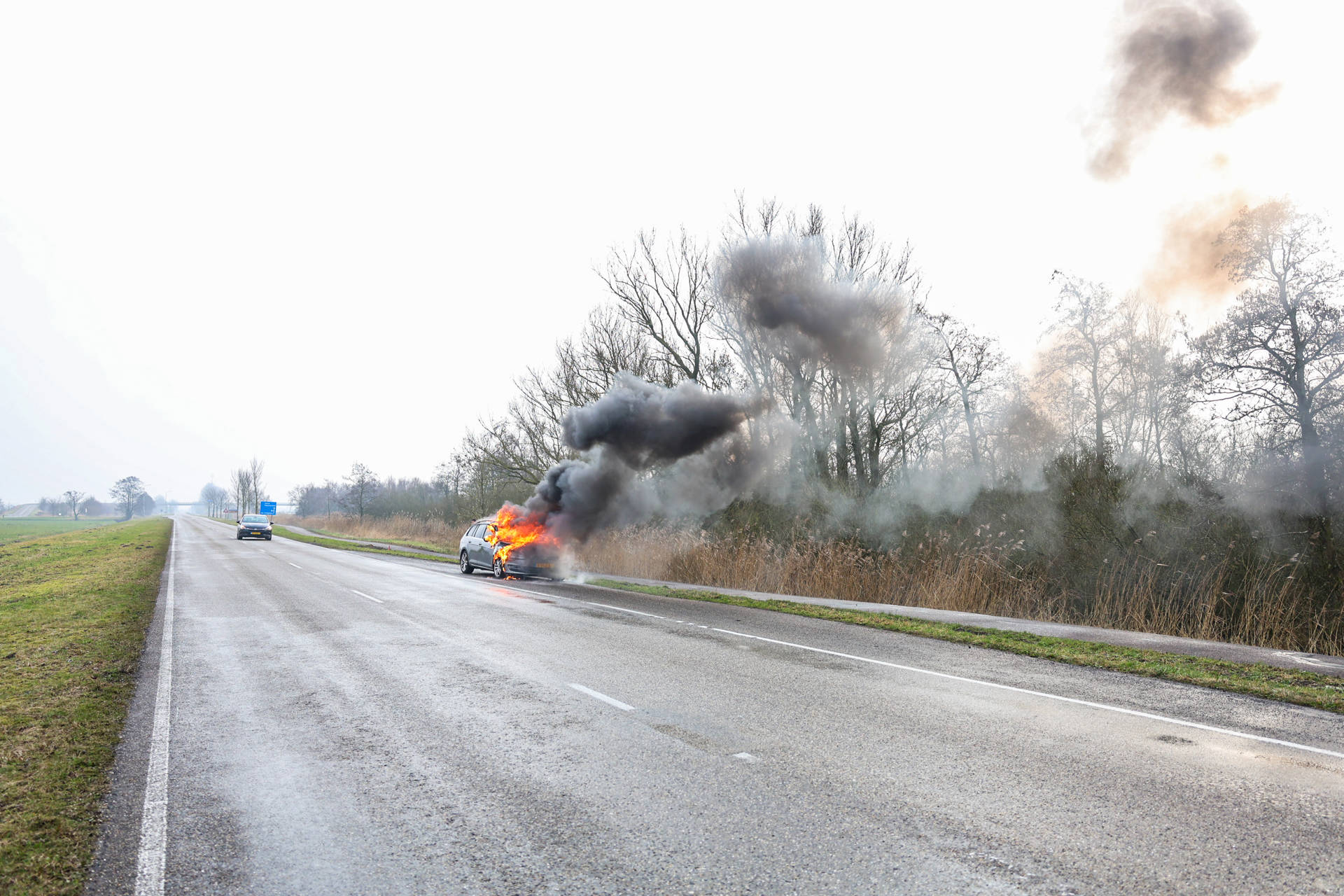 De brandweer van Joure werd rond 12.40 uur opgeroepen. Bij aankomst stond het voertuig al volledig in brand. De bestuurder had kort daarvoor een vreemde geur opgemerkt en zette de auto stil, waarna het vuur snel om zich heen greep.