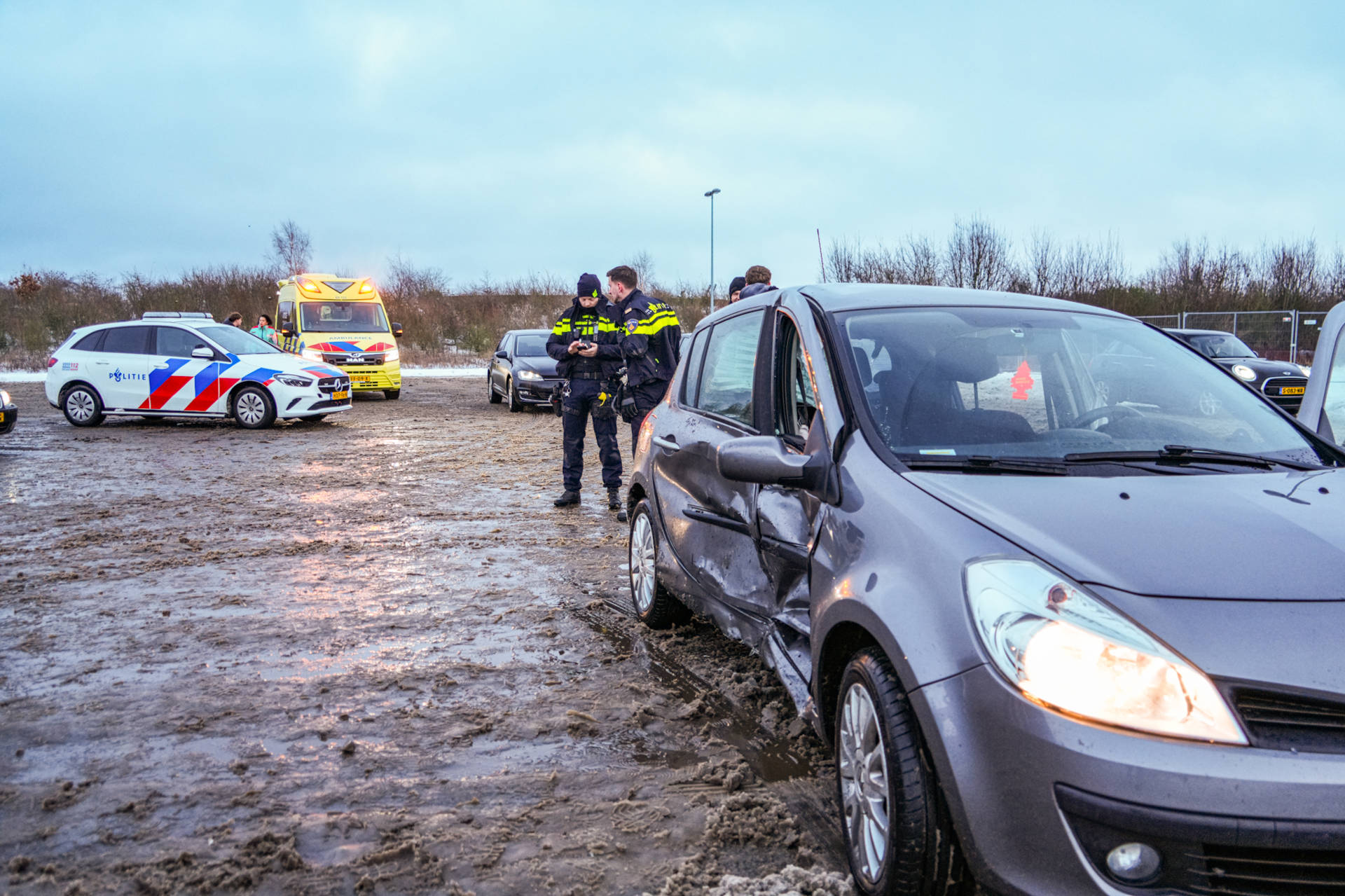Meerdere jongeren waren aanwezig op de parkeerplaats en waren bezig met het maken van driftbewegingen op het gladde wegdek. Door de impact raakten beide voertuigen beschadigd en ontstond een gevaarlijke situatie.