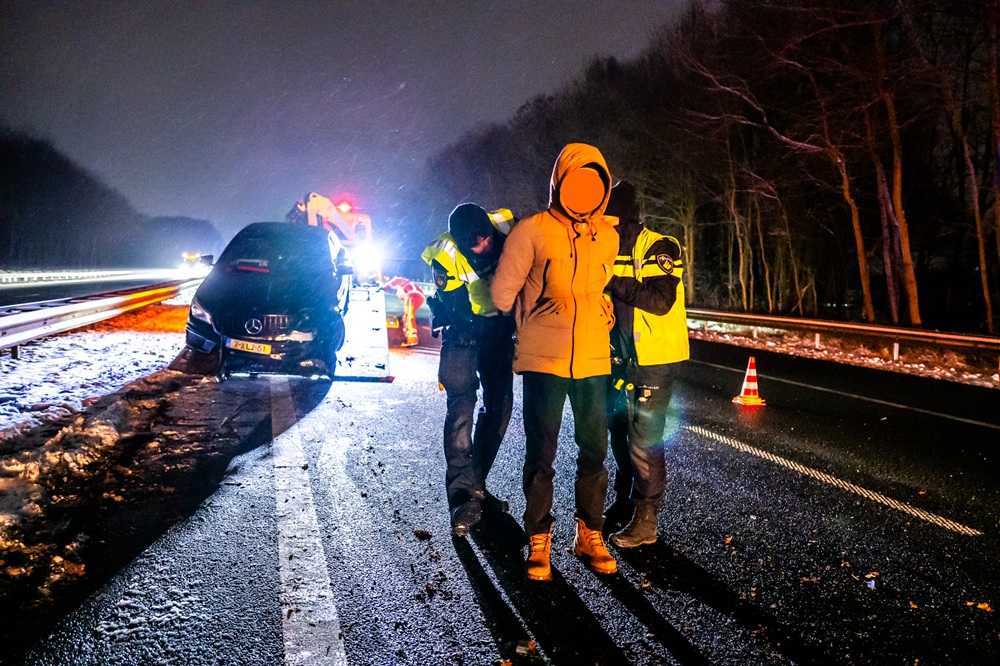 De man, die richting Groningen reed, verloor de controle over zijn auto, raakte in een slip en botste tegen de middengeleider. Hij bleef ongedeerd, maar bleek onder invloed van alcohol en werd na tegenstribbelen aangehouden. De politie onderzoekt of er ook andere middelen in het spel waren.