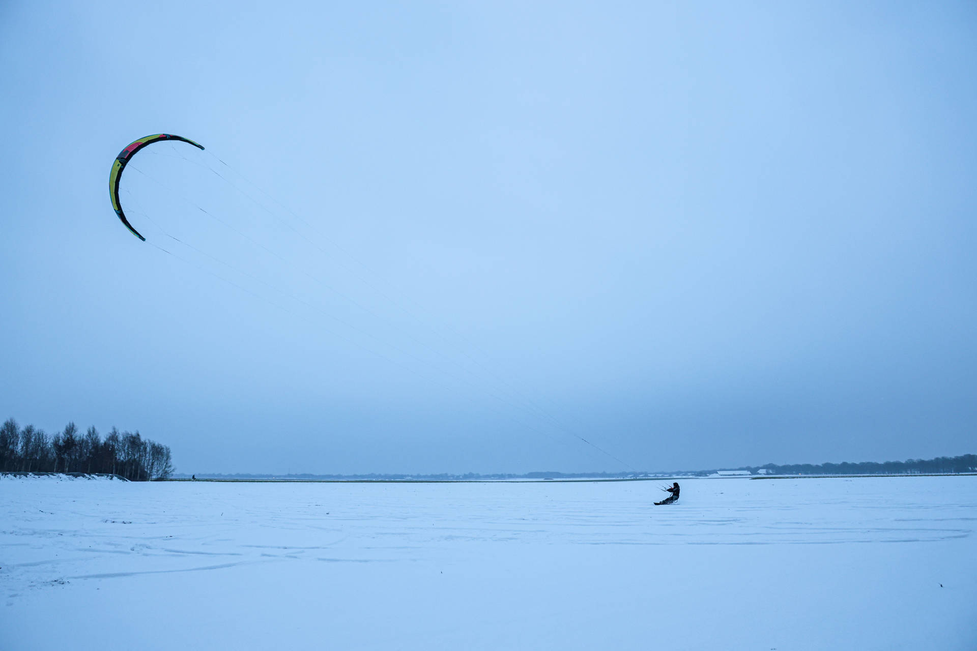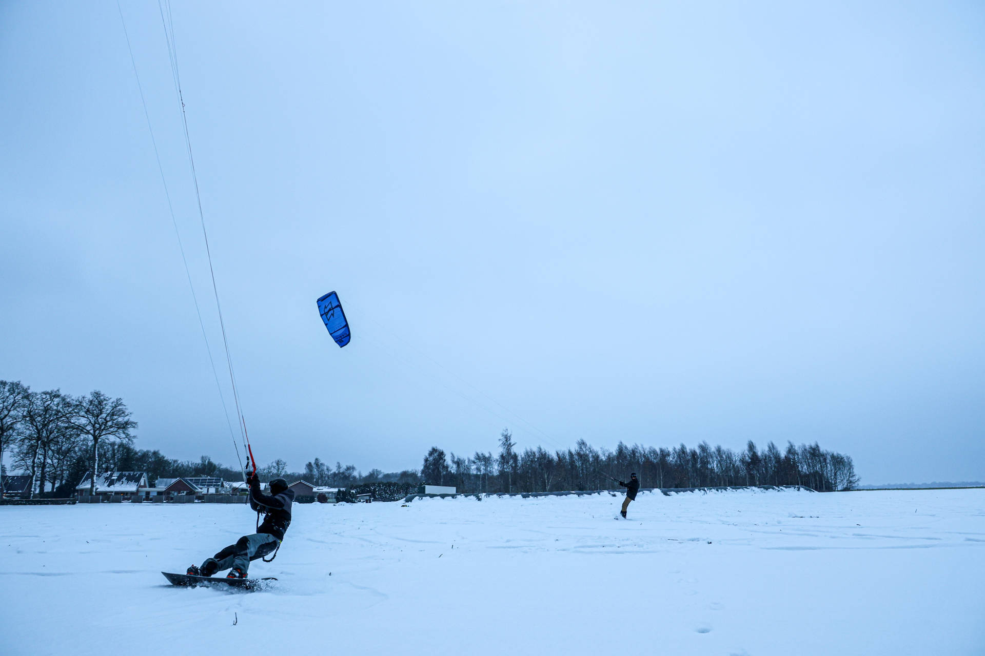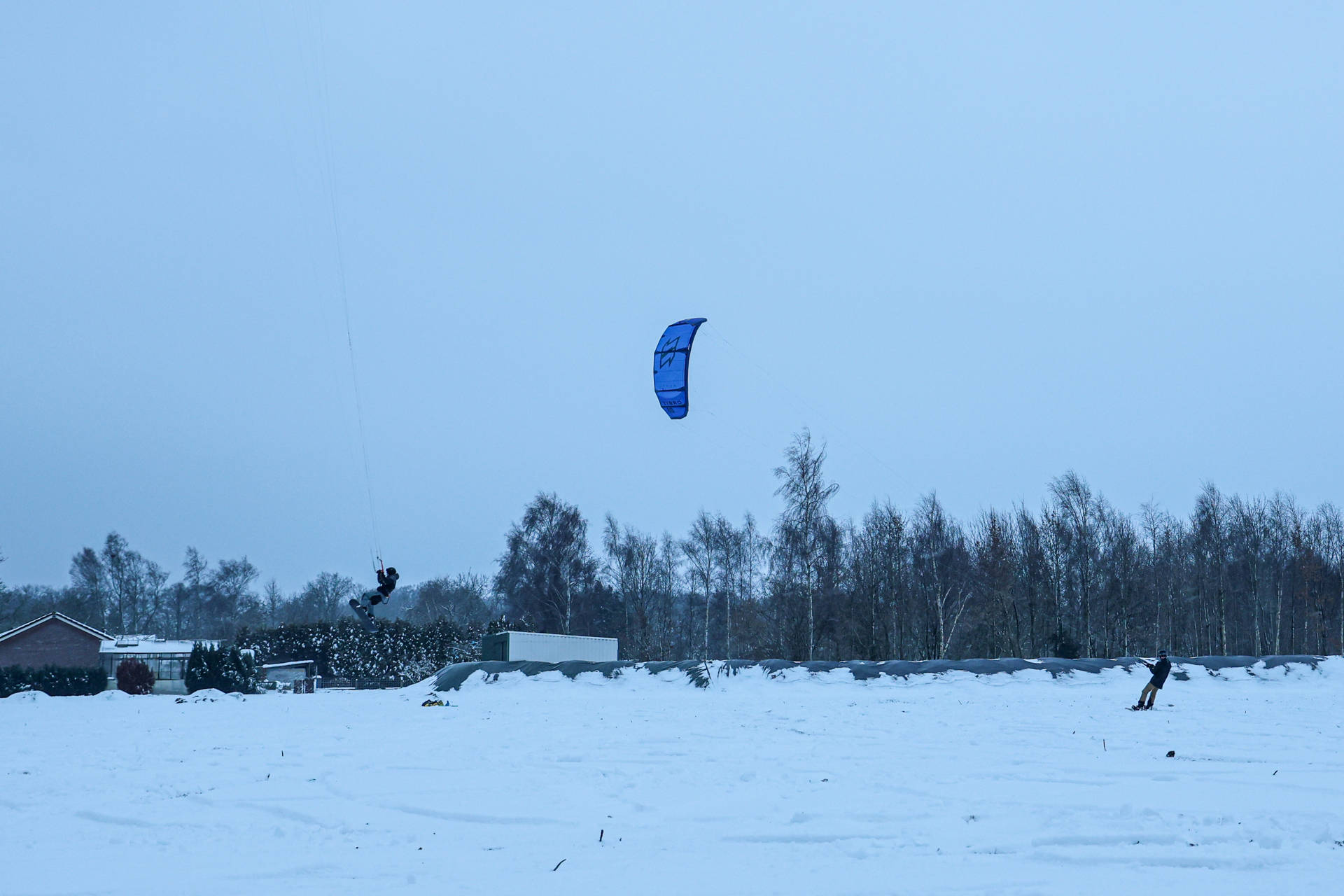 Kitesurfers zorgen voor spektakel in besneeuwd weiland
