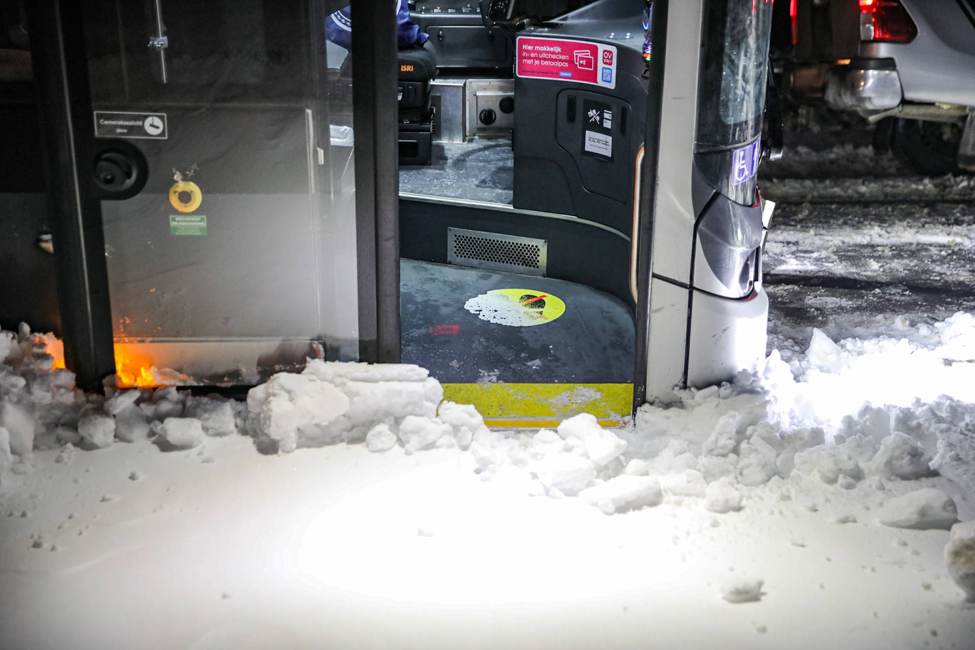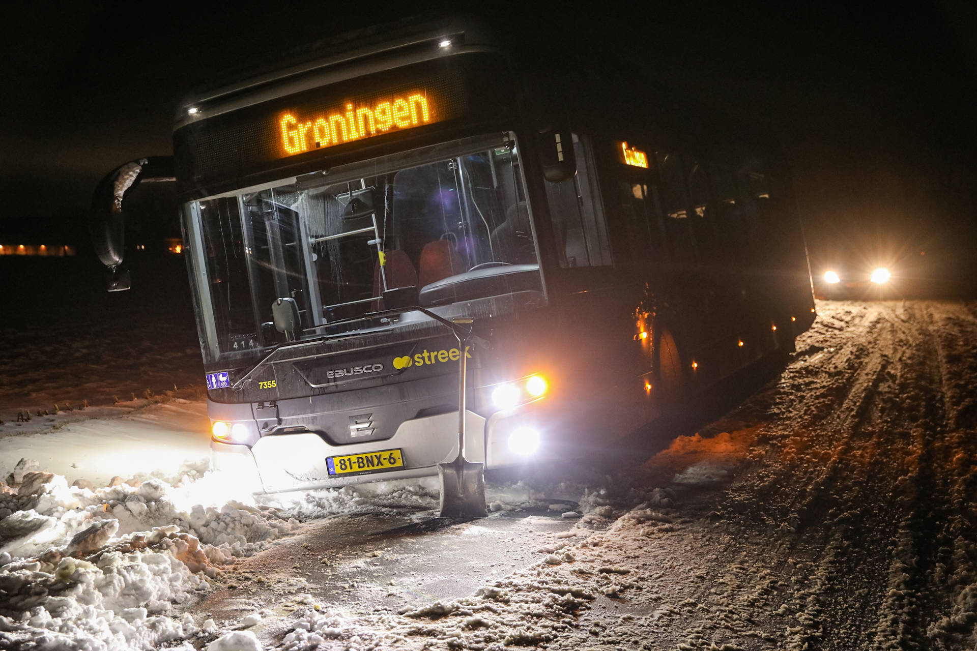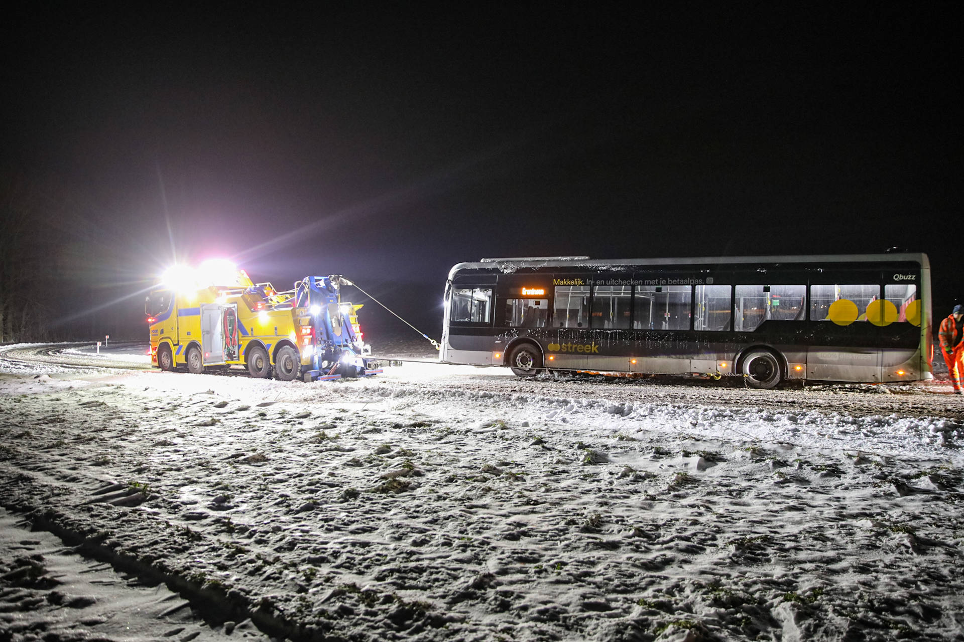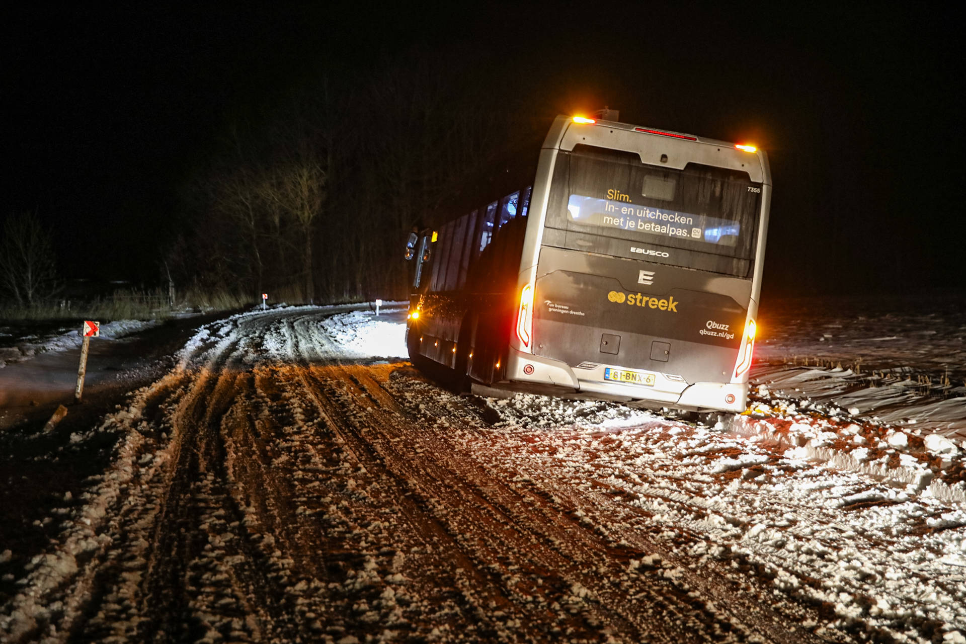 Sinds zaterdagmiddag werd de dienstregeling van Qbuzz weer opgestart na tijdelijke stop vanwege hevige sneeuwval. Het is niet bekend of er passagiers in de bus zaten toen deze vast kwam te zitten.