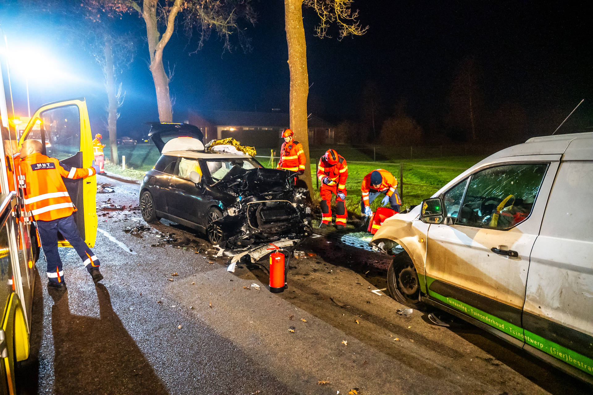 De weg is volledig afgesloten. De politie doet ter plaatse onderzoek naar de oorzaak van het ongeval.