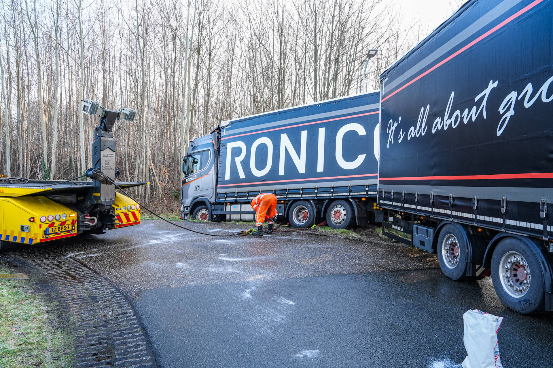 Twee vrachtwagens vast in berm door gladheid op industrieterrein