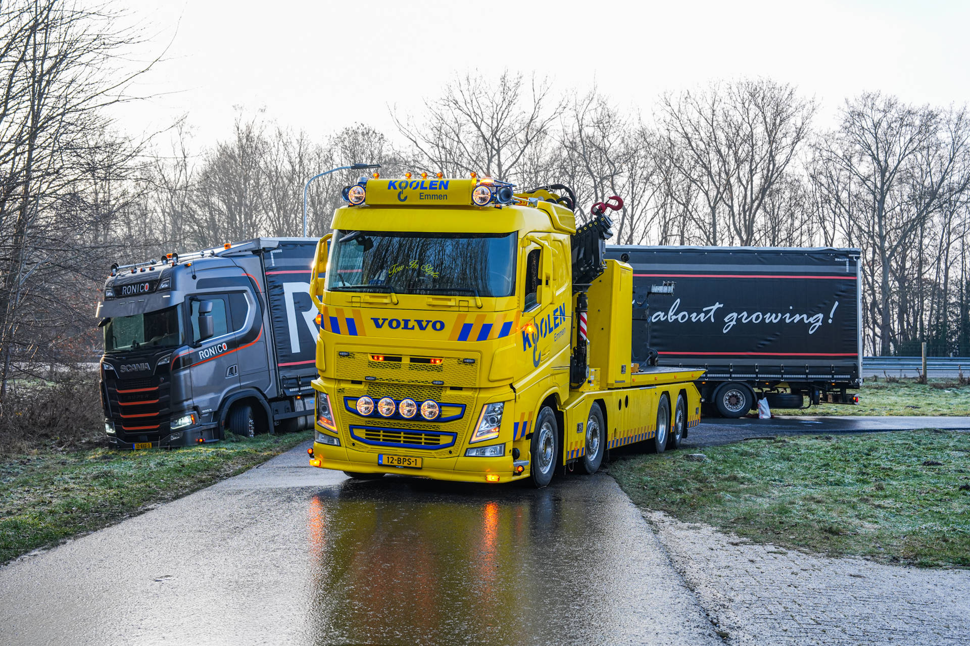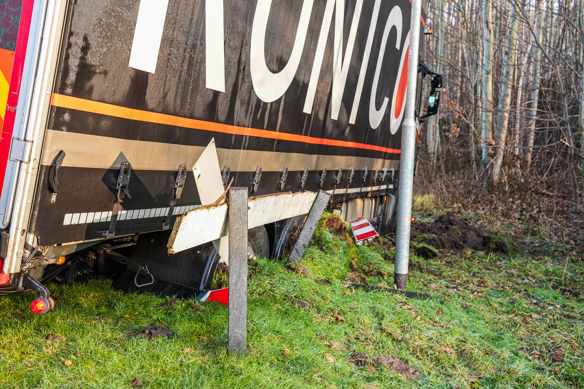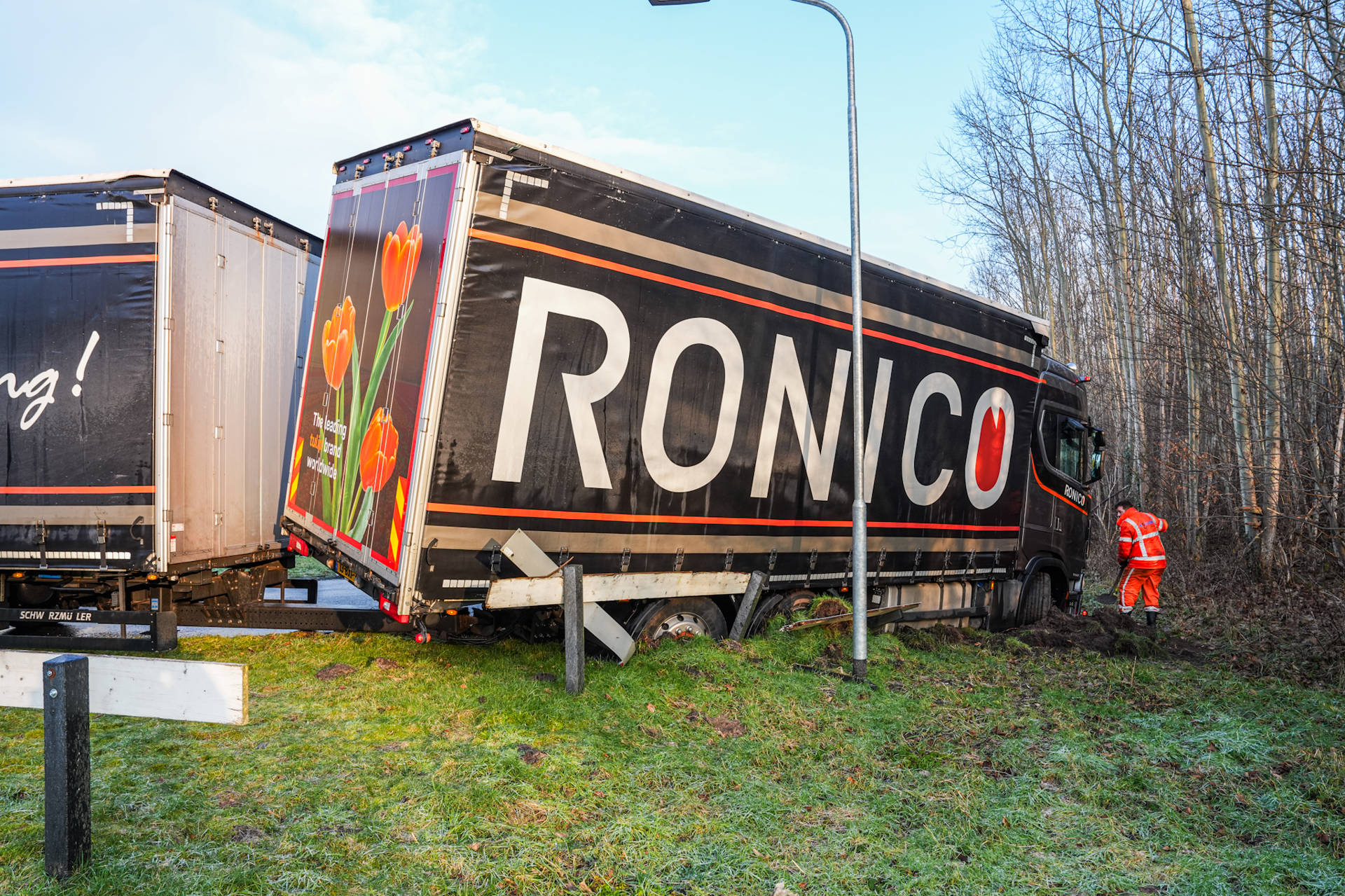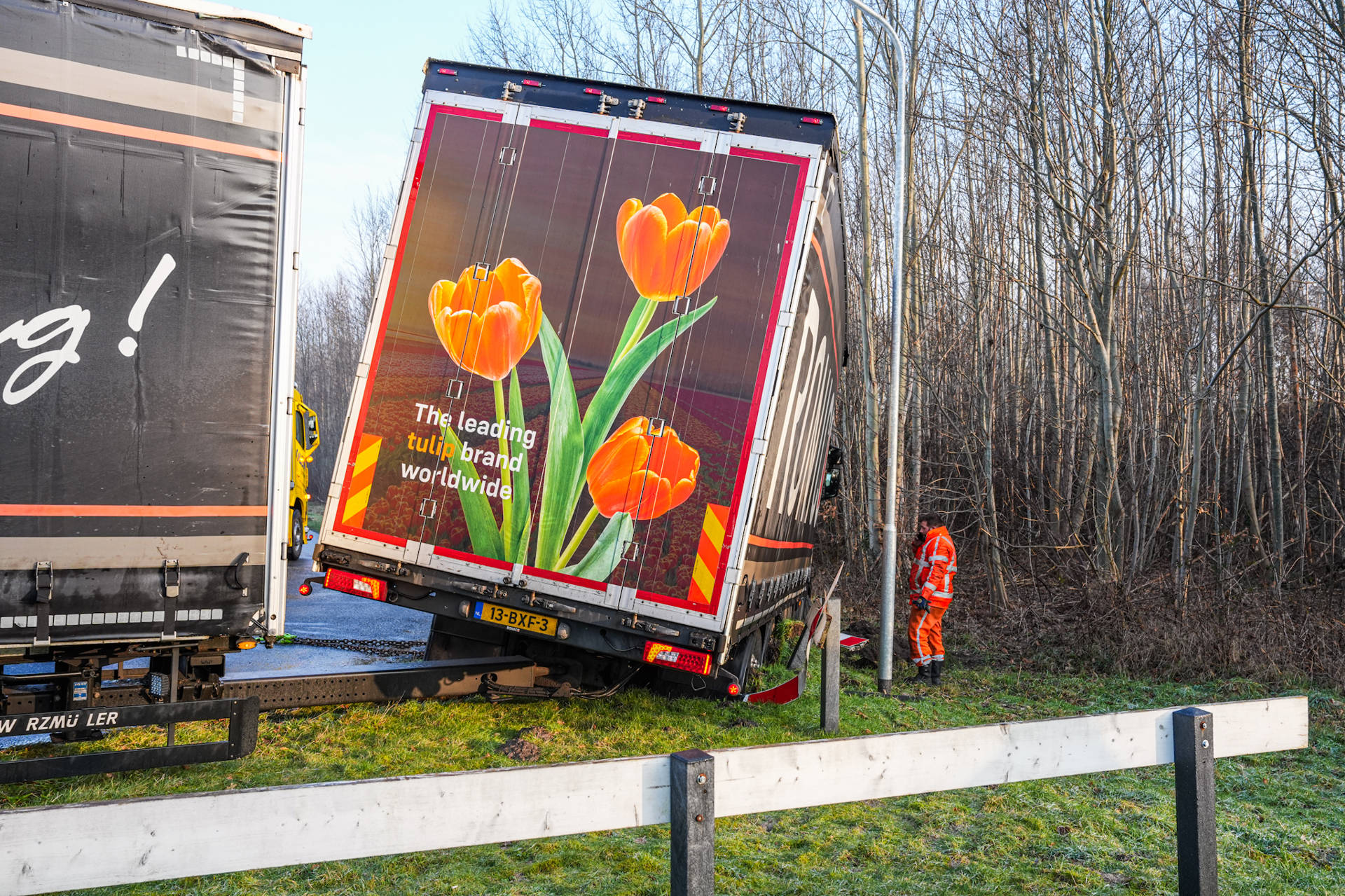Op De Streek, net langs de A37, ging een vrachtwagencombinatie met een lading van ongeveer 35 ton bloembollen glijden. Het voertuig raakte daarbij een schrikbord en kwam ongeveer een halve meter diep in de berm vast te zitten. Ondanks het zware gewicht bleef de vrachtwagen overeind staan.