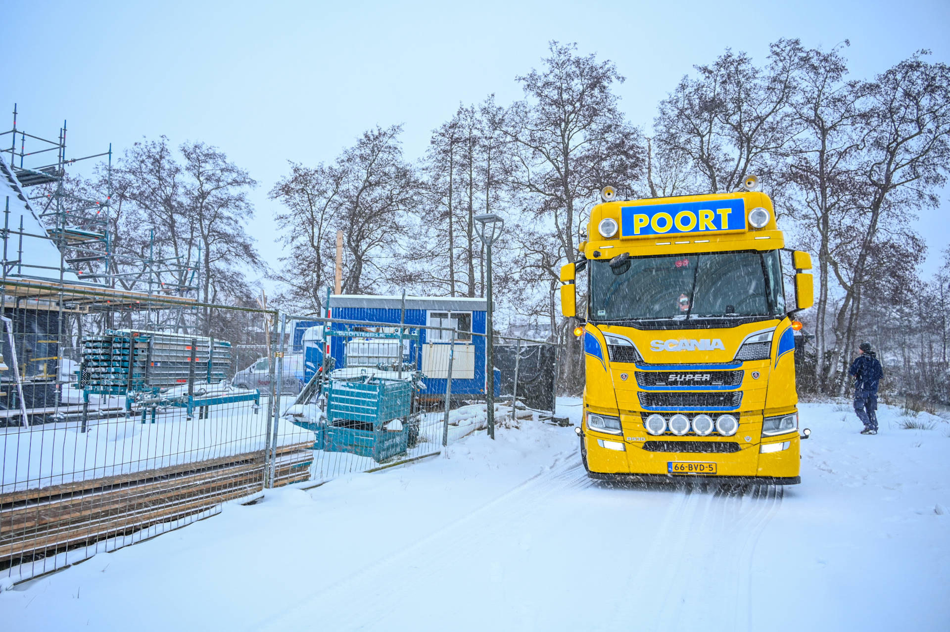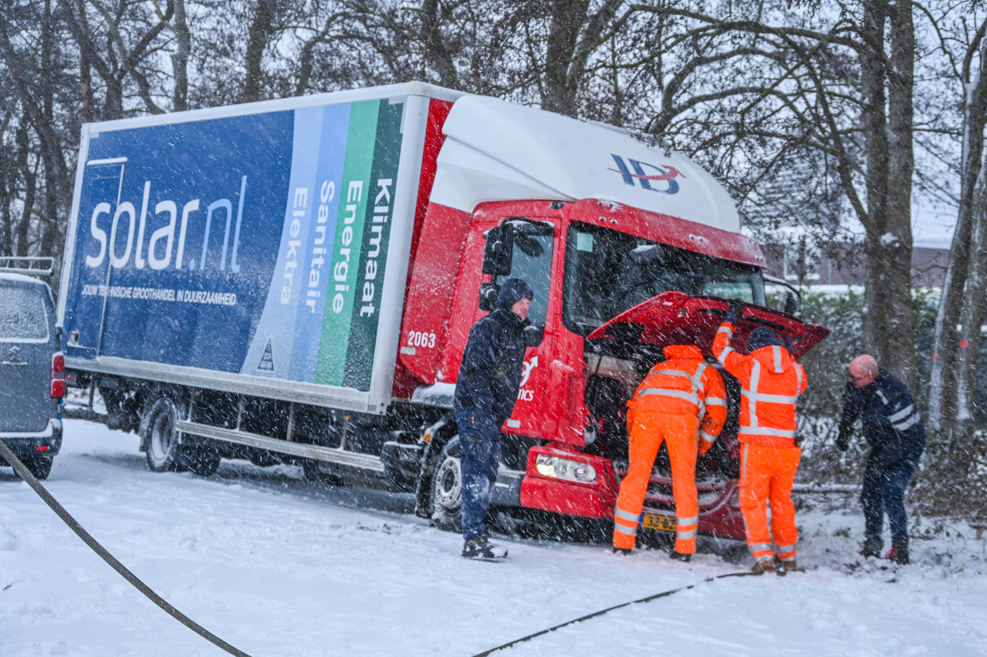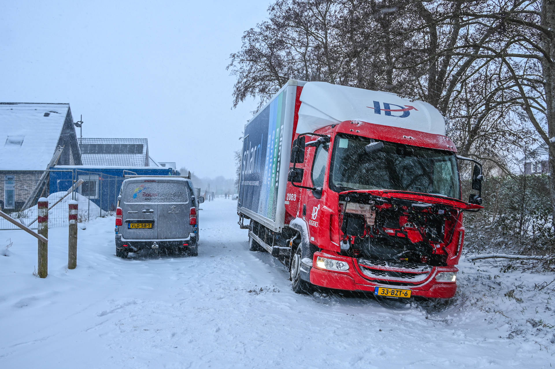 Door de besneeuwde weg was het wegdek slecht zichtbaar. Tijdens het manoeuvreren raakte de vrachtwagen van de weg en gleed in de greppel. Pogingen van de chauffeur en installateurs die in de woning aan het werk waren om het voertuig los te krijgen, hadden geen succes.