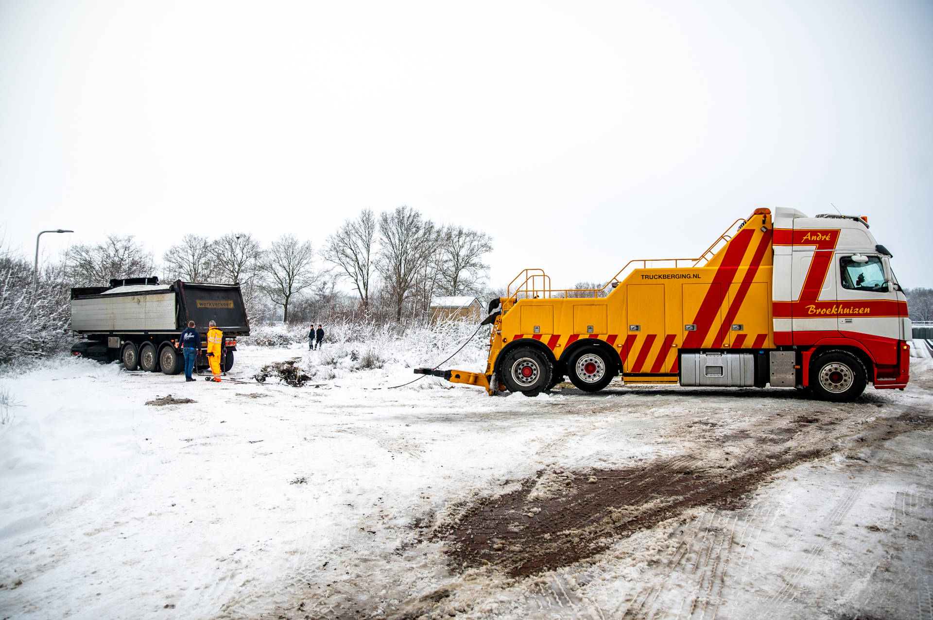 Bergingsbedrijf André Broekhuizen is ter plaatse om de vrachtwagen te bergen, maar ook voor de bergers zorgt de gladheid voor extra risico’s. De chauffeur wacht inmiddels al zo’n vier uur langs de weg op hulp.