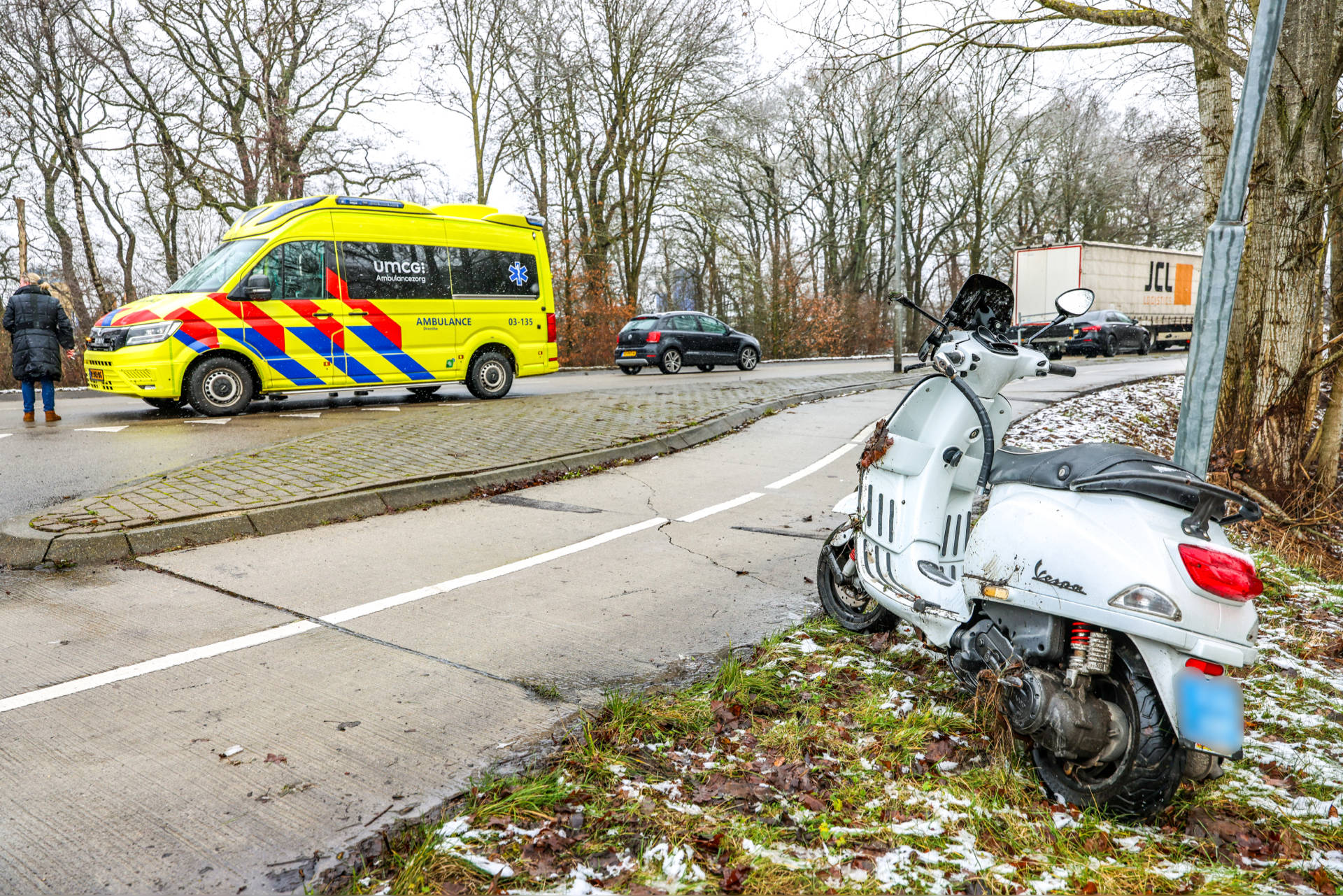 Een scooterrijdster ging onderuit op de oversteekplaats bij de kruising. Omstanders snelden toe om haar eerste hulp te verlenen in afwachting van de hulpdiensten.