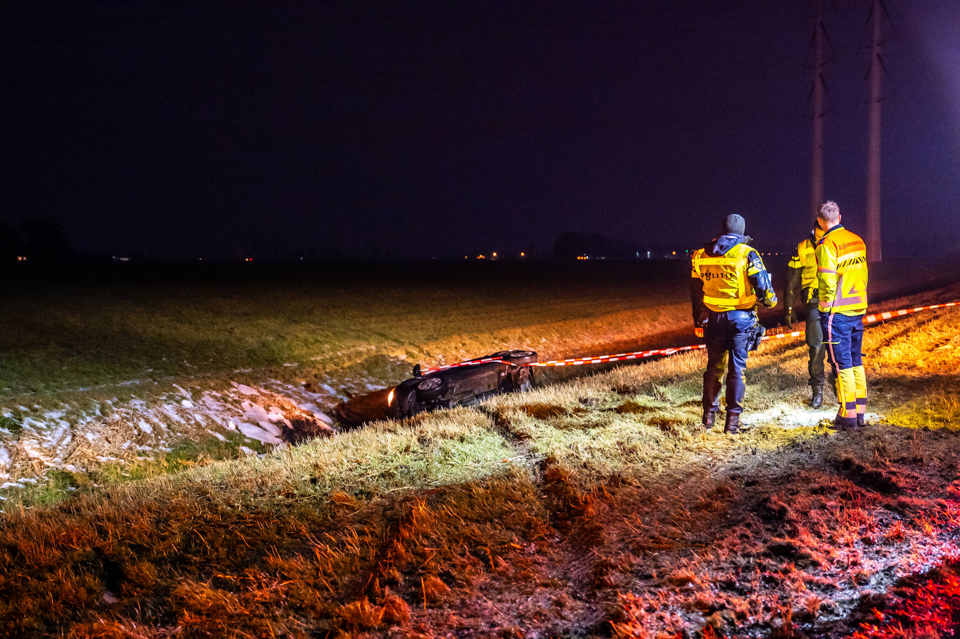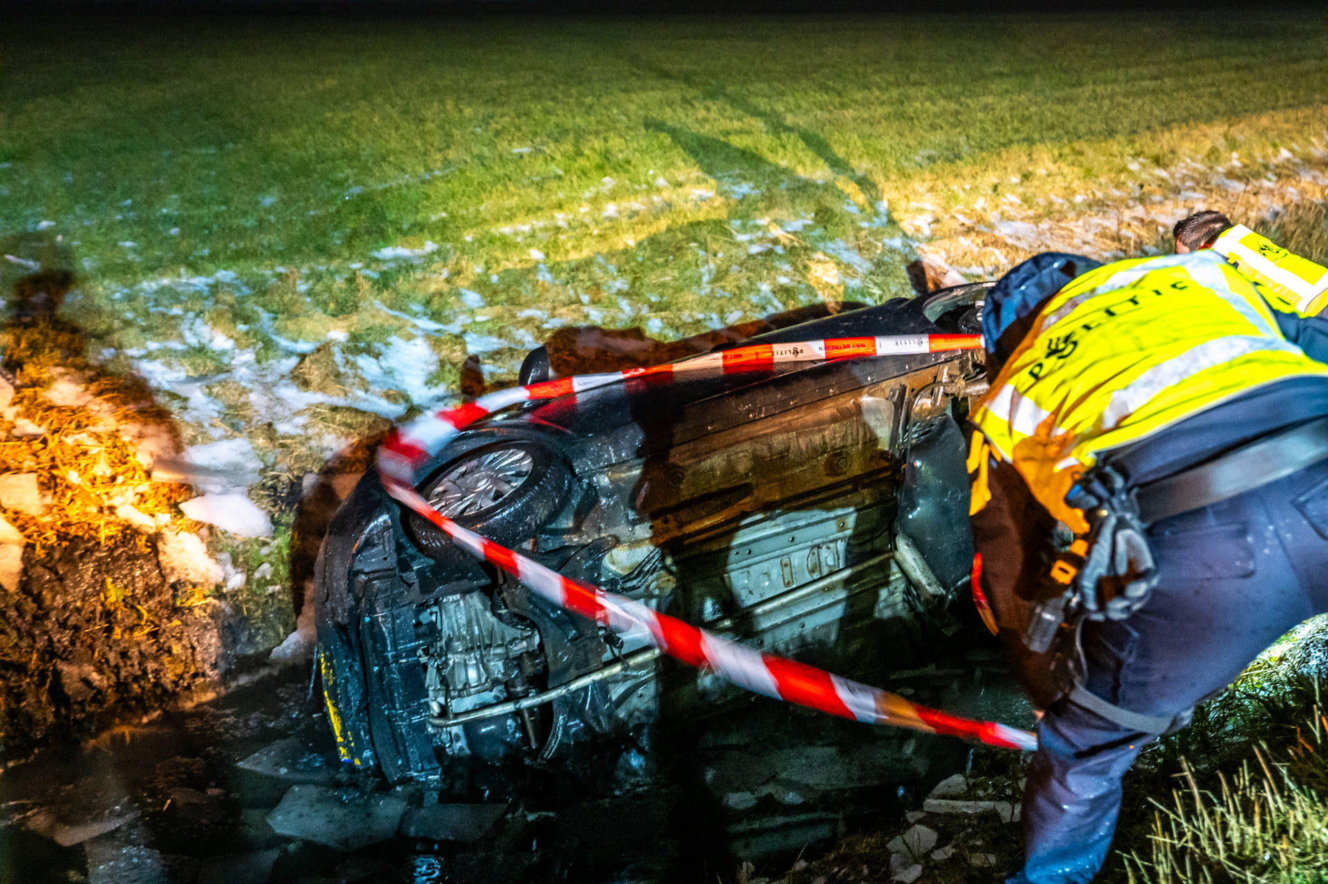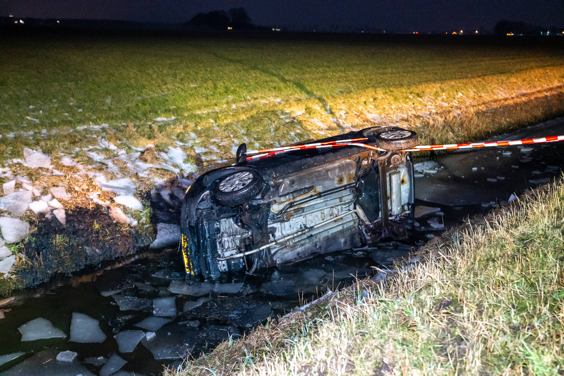 De melding kwam rond 21.18 uur binnen. Ter plaatse bleek de auto in een sloot met ijs te zijn terechtgekomen en op de zijkant tot stilstand te zijn gekomen. In het voertuig zaten twee vrouwen. Zij zijn ter plekke gecontroleerd door ambulancepersoneel, maar raakten niet gewond en kwamen met de schrik vrij.
