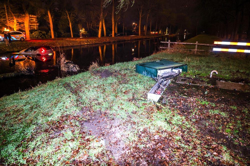 Een automobilist miste een bocht en reed rechtdoor. Daarbij werd een stroomkast geraakt, waarna het voertuig van de weg raakte en in het naastgelegen kanaal tot stilstand kwam.