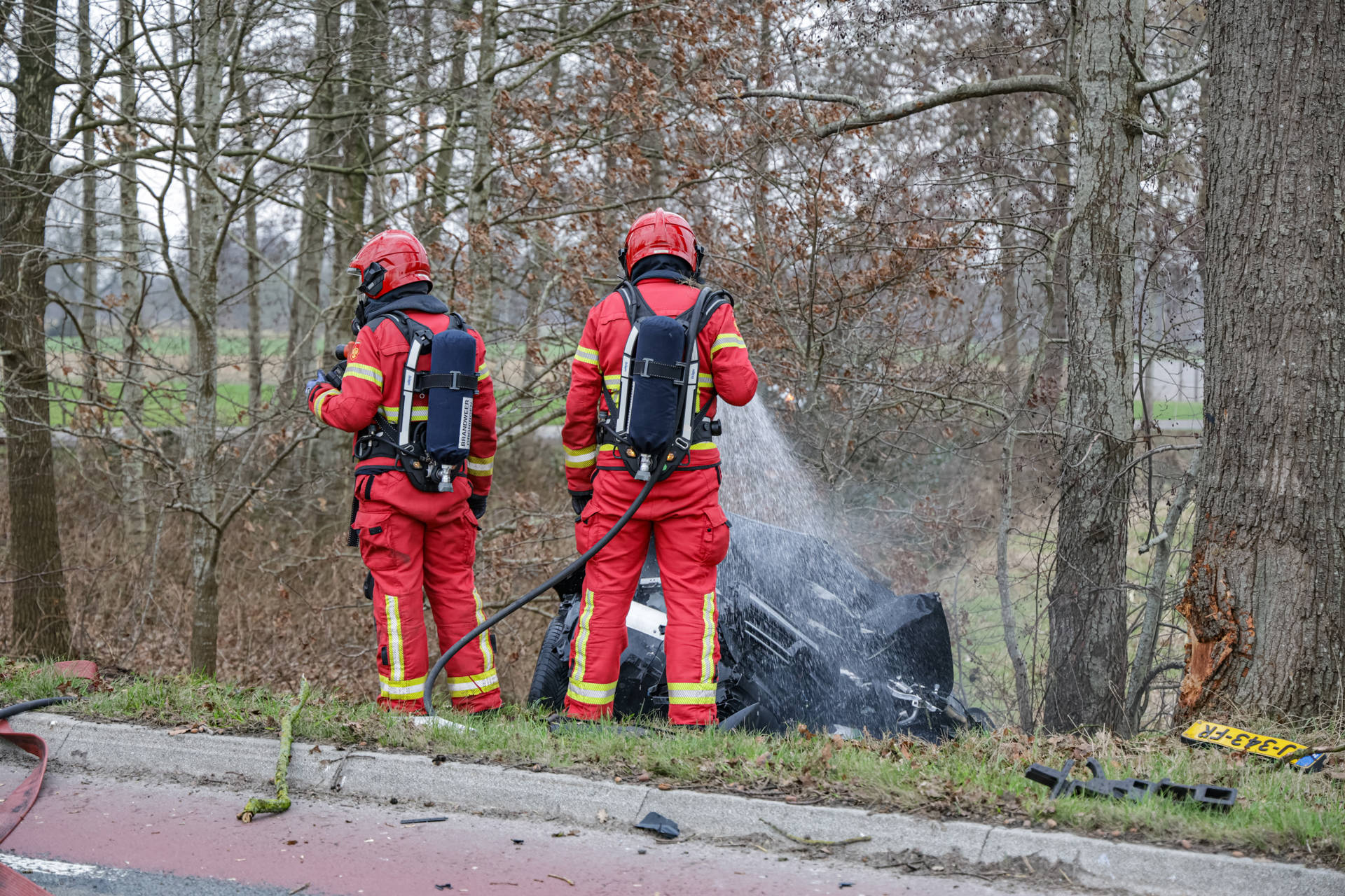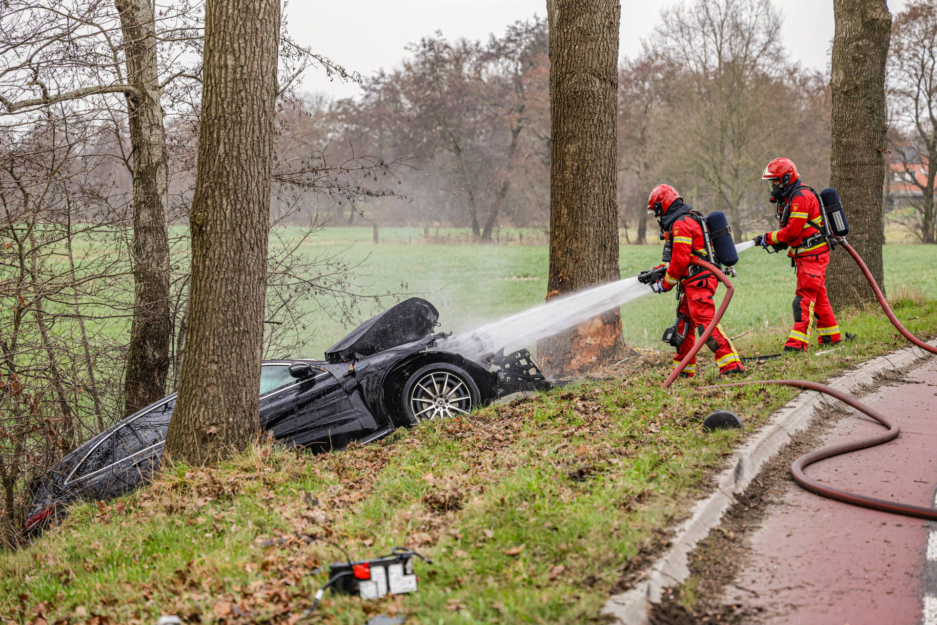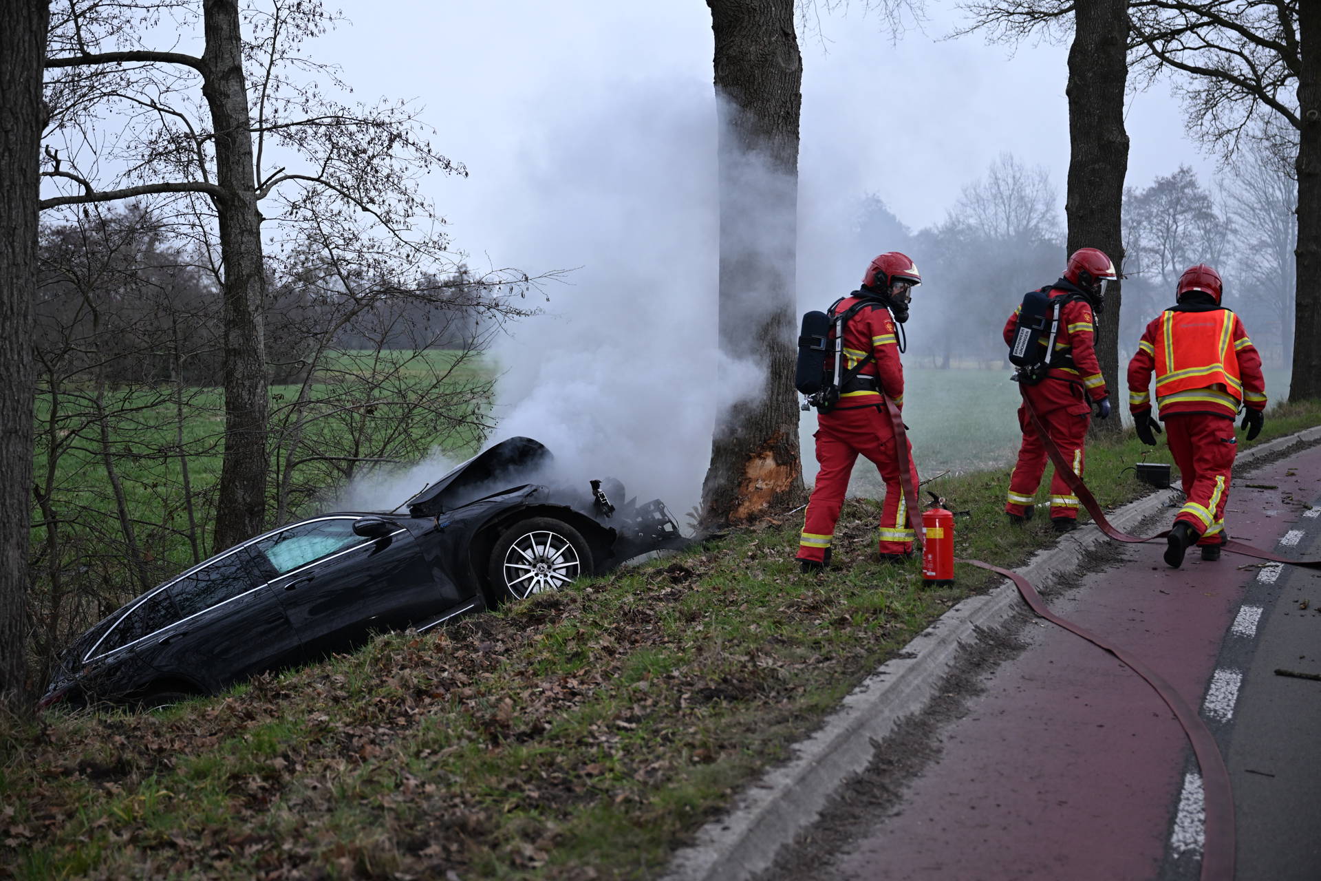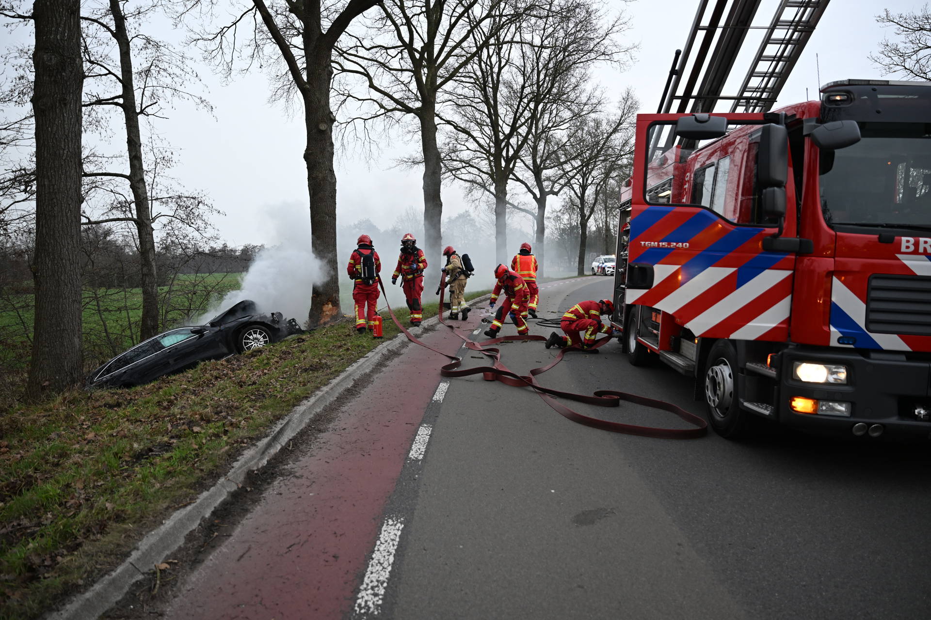 Auto vliegt in brand na crash tegen boom