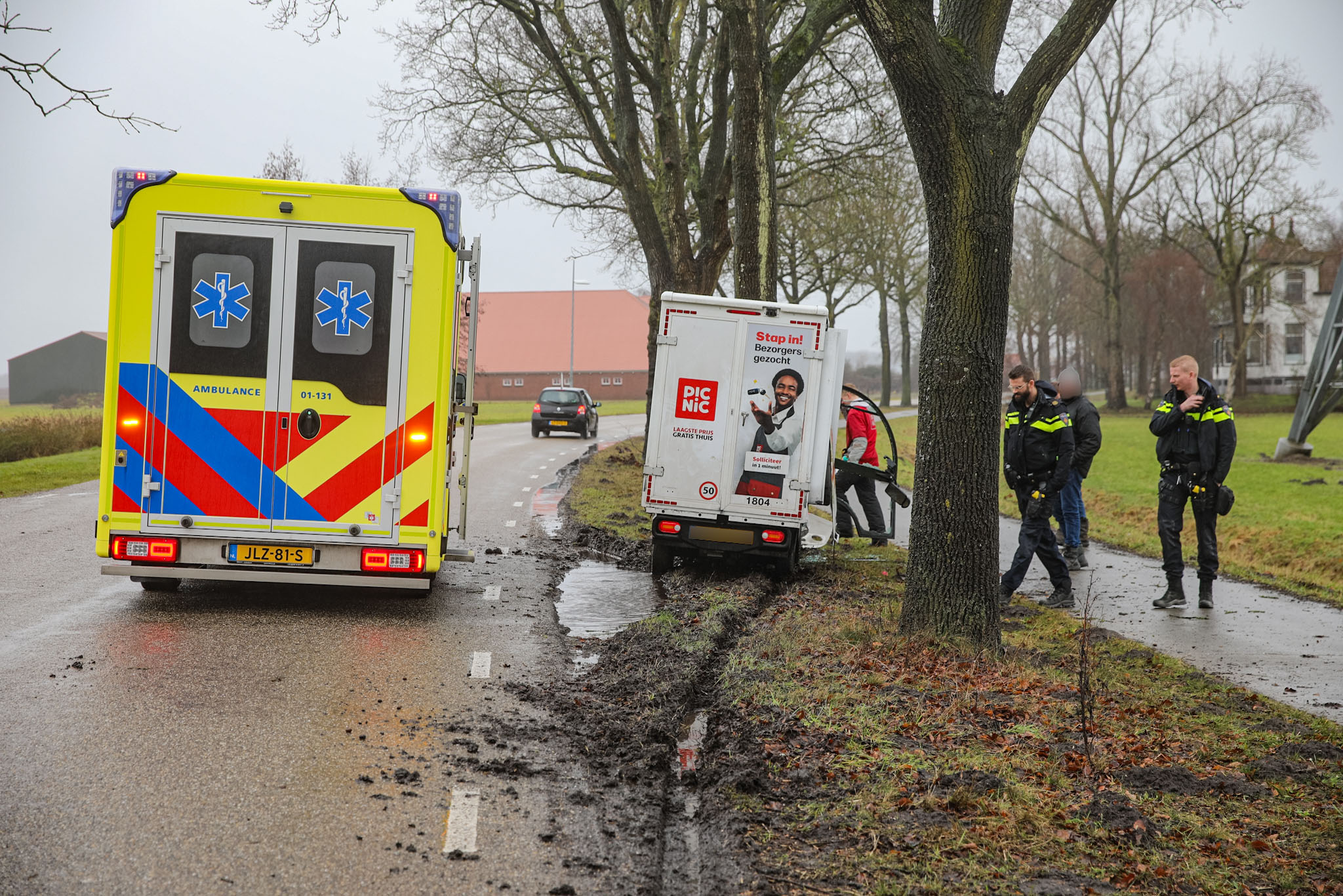 Geplaatst op 22 februari 2026, om 15:19 uurMEEDEN – Zondagmiddag is rond 13:15 uur een eenzijdig ongeval gebeurd aan de Herenweg in Meeden. Een bezorgauto van Picnic raakte daarbij van de weg en botste tegen een boom.