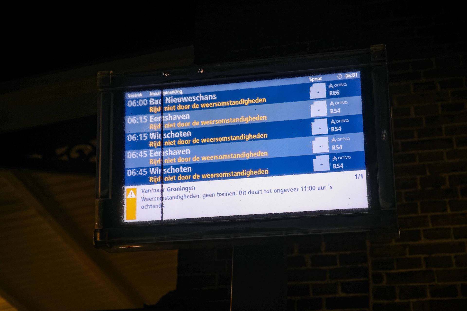 Woensdagochtend rijden er geen treinen van Arriva en NS. Van en naar de stations Groningen en Leeuwarden ligt het treinverkeer stil, naar verwachting tot 11.00 uur. De uitval wordt veroorzaakt door ijzel op de bovenleiding, waardoor treinen geen stroom krijgen. De situatie wordt gedurende de ochtend opnieuw beoordeeld.