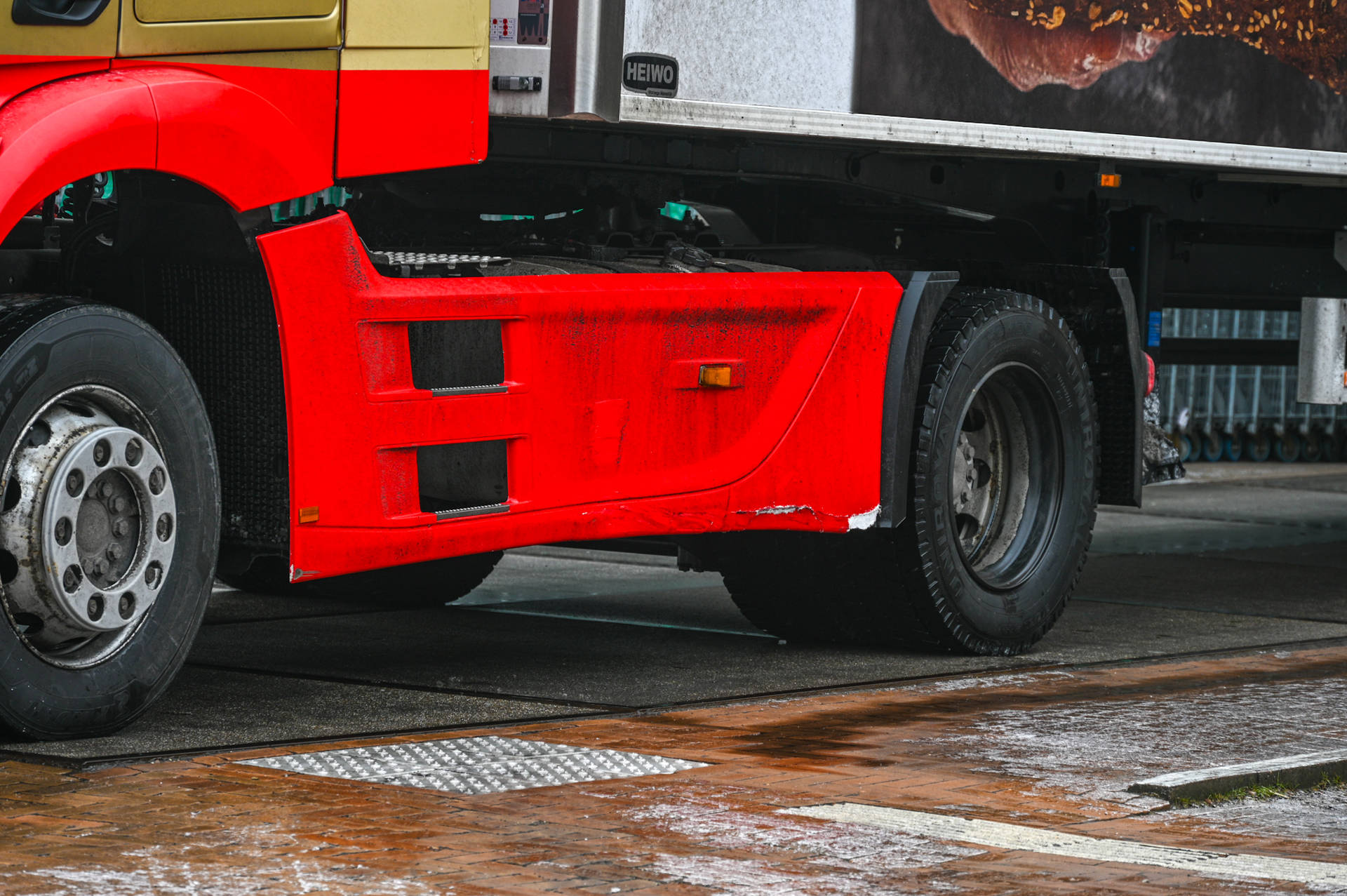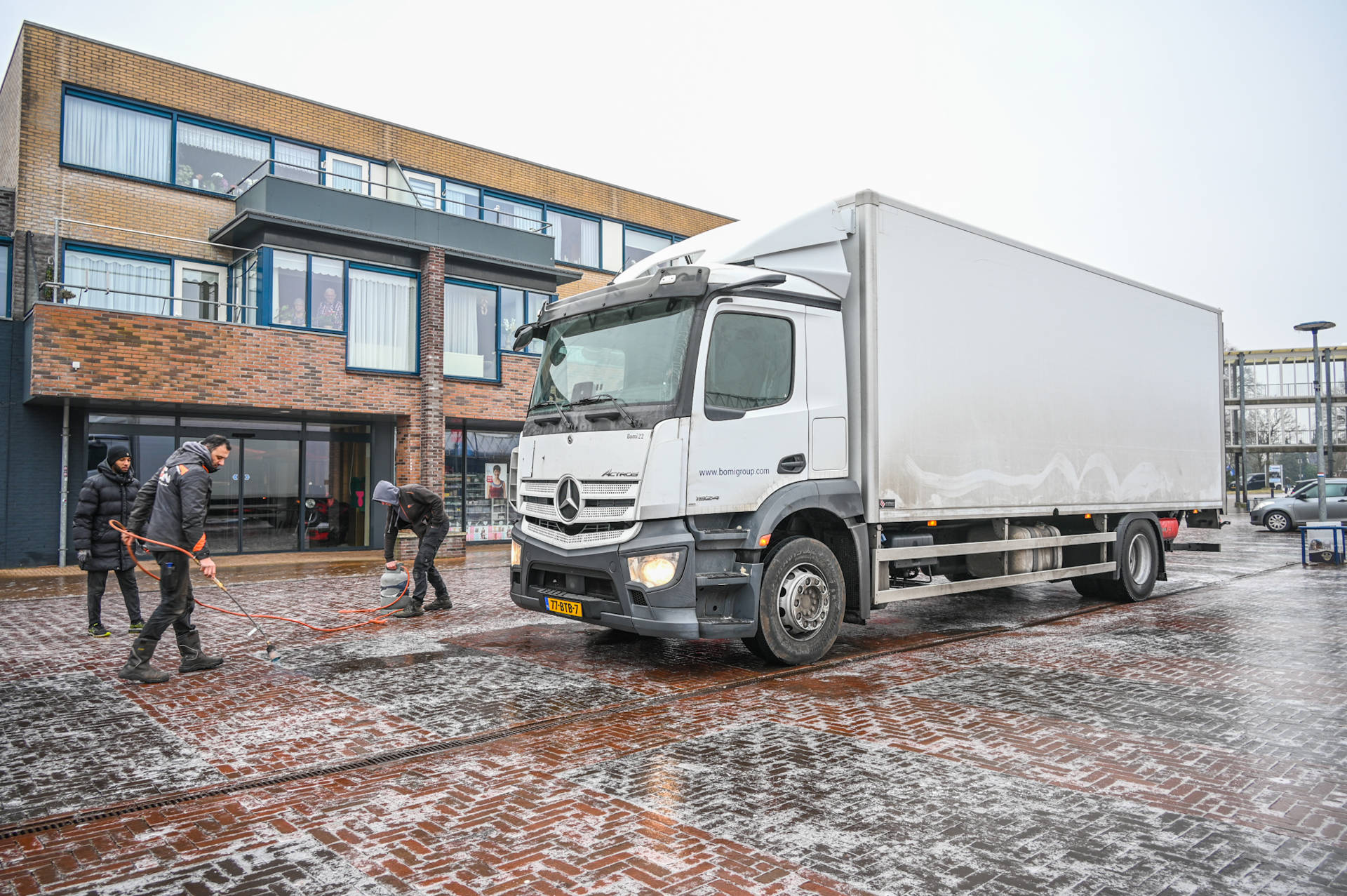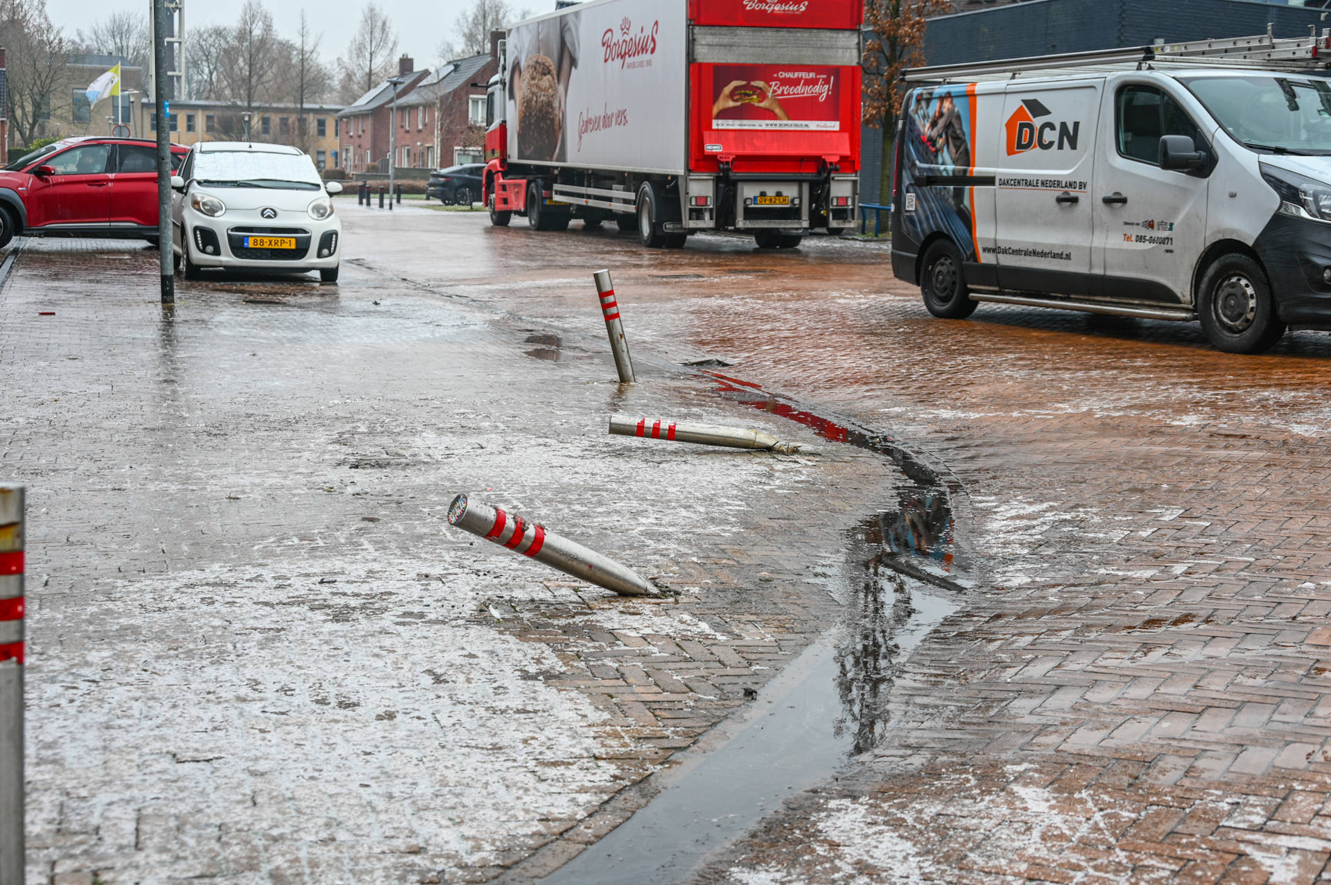 Rond 08.00 uur raakte een vrachtwagen die verse broden kwam lossen voor een supermarkt aan de Wendtsteinweg in de problemen. Tijdens een manoeuvre schoof het voertuig omhoog tegen meerdere paaltjes en kwam het tot stilstand vlak voor de ingang van een barbershop. De vrachtwagen bleef wegglijden en versperde de volledige weg. Een tweede vrachtwagen probeerde via een parkeerplaats te passeren, maar kwam eveneens vast te zitten op het ijs.