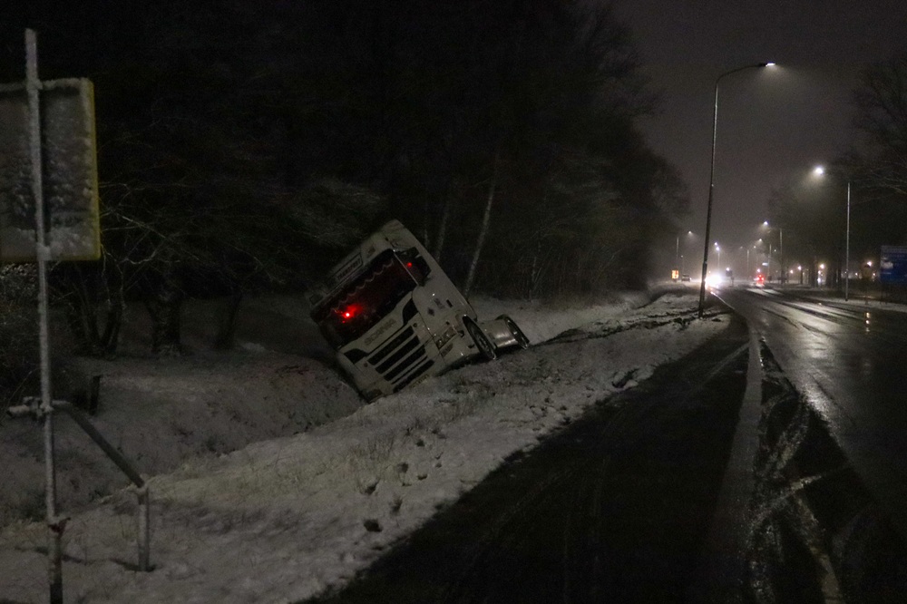 Door de gladheid verloor de chauffeur de controle over het voertuig, waarna de vrachtwagen naast de weg tot stilstand kwam.