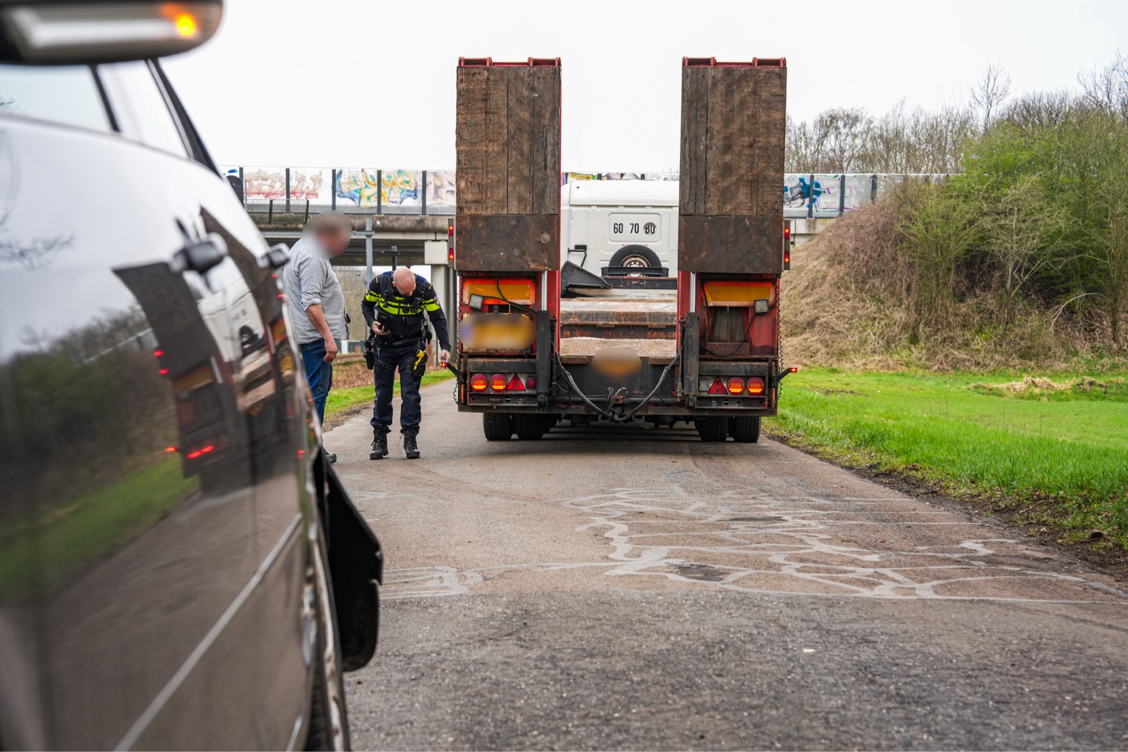 Auto schuurt langs vrachtwagen op smalle omleidingsroute, weg afgesloten