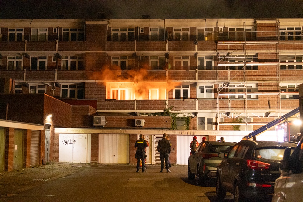 De brandweer kreeg in de nachtelijke uren een melding van een woningbrand en trof bij aankomst vuur aan op het balkon aan de achterzijde van een woning in een flatgebouw. De brandweer is ingezet om de brand te blussen.