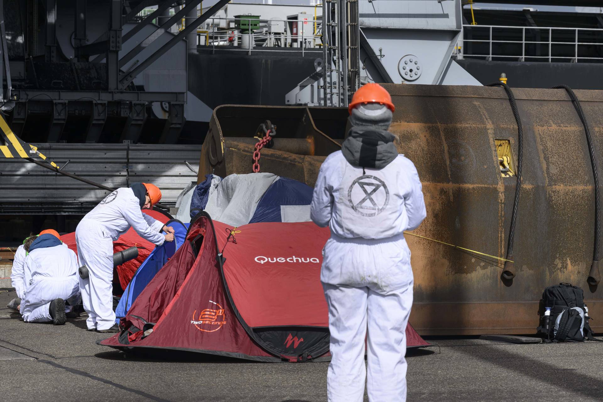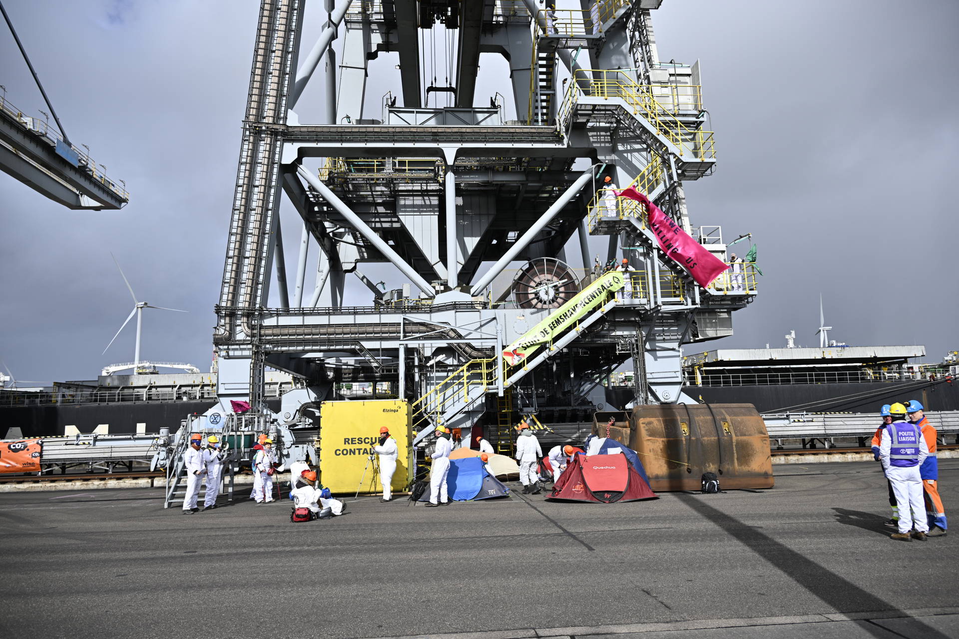 Rond het middaguur betraden de demonstranten, gekleed in witte overalls, het terrein door over een hek te klimmen. Vervolgens richtten zij een tijdelijk kampement in op de kade, waarbij tenten werden opgezet en spandoeken werden bevestigd aan installaties die worden gebruikt voor het lossen van kolenschepen. Door de actie kan een aanwezig kolenschip voorlopig niet worden gelost.