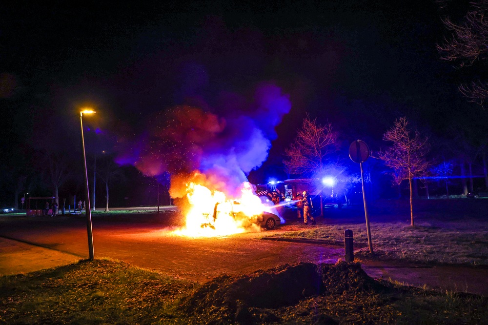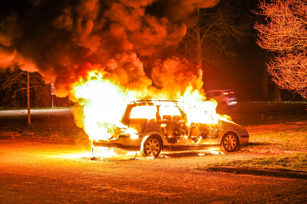 Op een carpoolplaats stond een auto volledig in brand. De brandweer had het vuur snel onder controle.