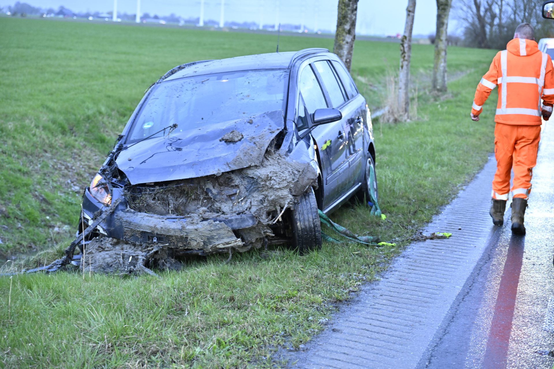 Door de gladheid verloor de bestuurder de controle over het voertuig, miste op een haar na een boom en belandde uiteindelijk op de kop in een sloot. De bestuurder wist zelfstandig uit het voertuig te komen.