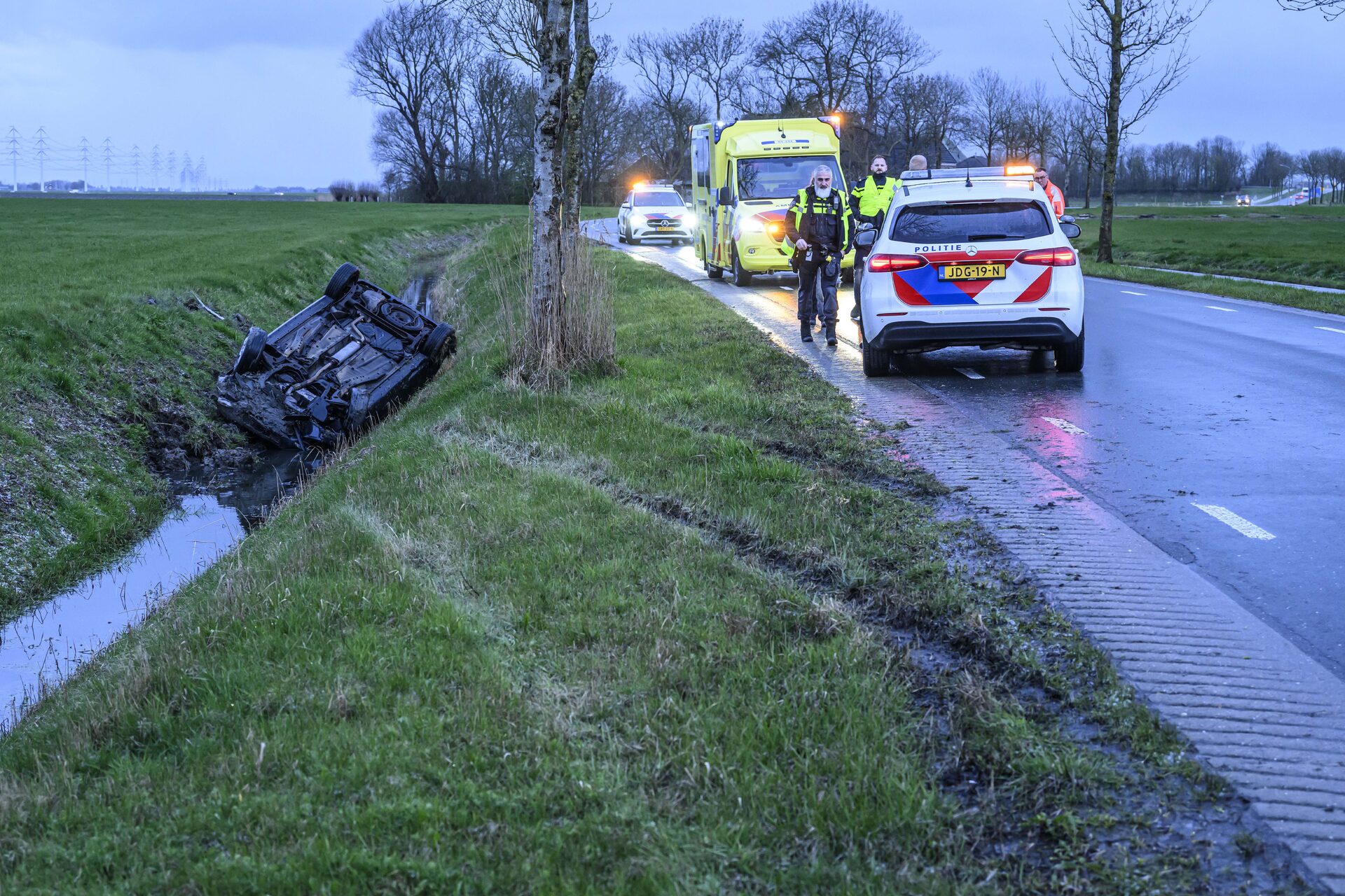 Door de gladheid verloor de bestuurder de controle over het voertuig, miste op een haar na een boom en belandde uiteindelijk op de kop in een sloot. De bestuurder wist zelfstandig uit het voertuig te komen.