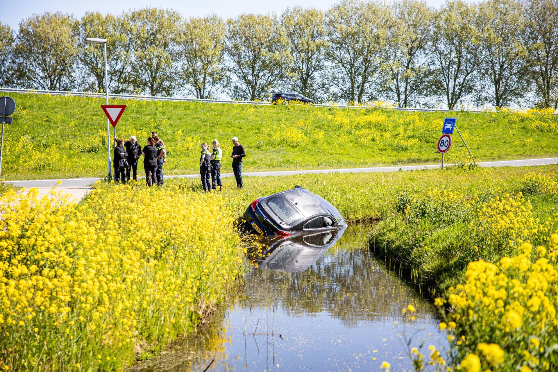 Een auto raakte door nog onbekende oorzaak van de rotonde naast de A7 en kwam in een sloot terecht. De bestuurder bleef ongedeerd.