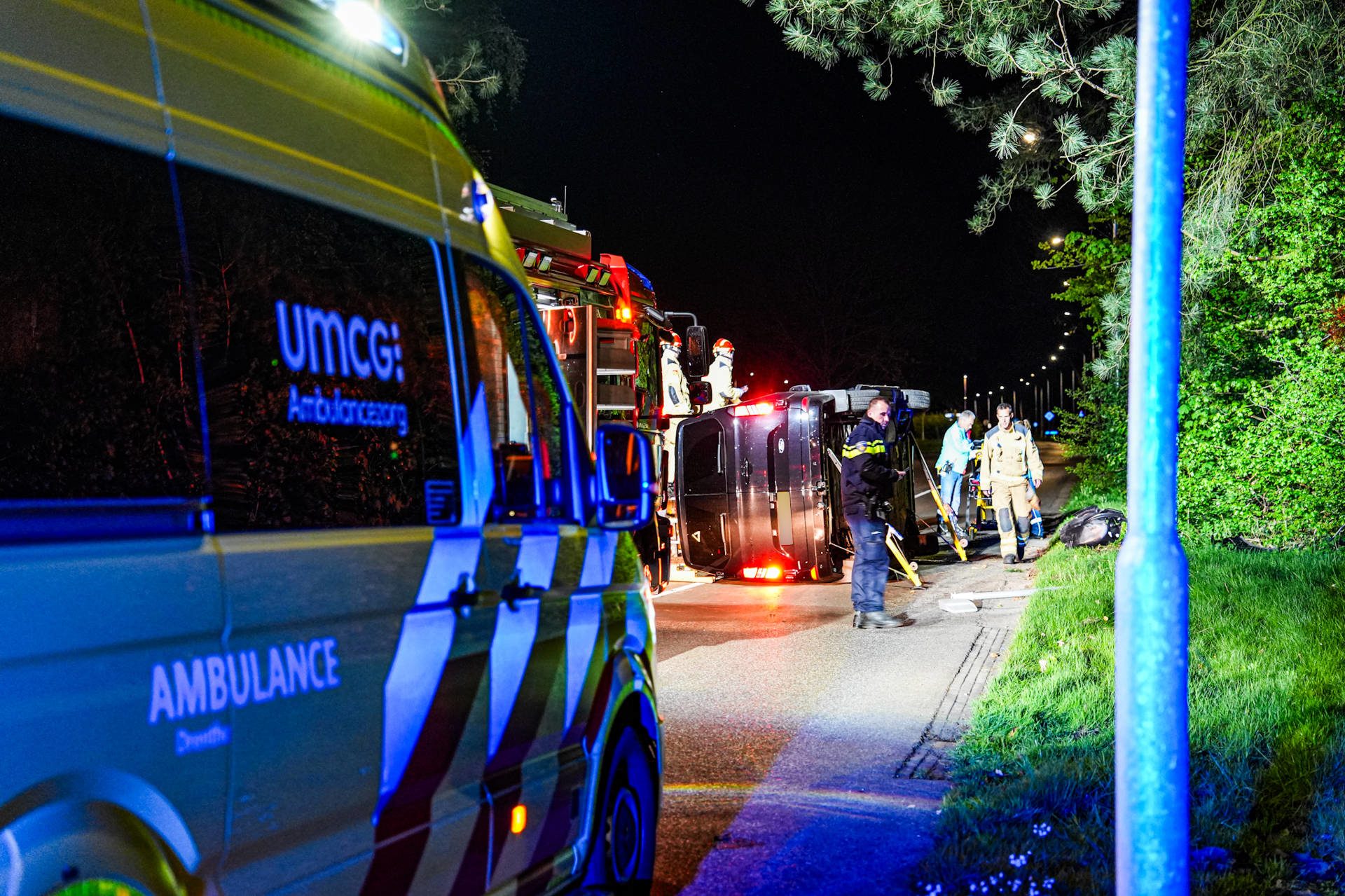De melding kwam rond 23:23 uur binnen. Ter plaatse bleek dat een bestelbus door nog onbekende oorzaak op de zijkant was beland. Bij aankomst zat het slachtoffer nog in het voertuig.