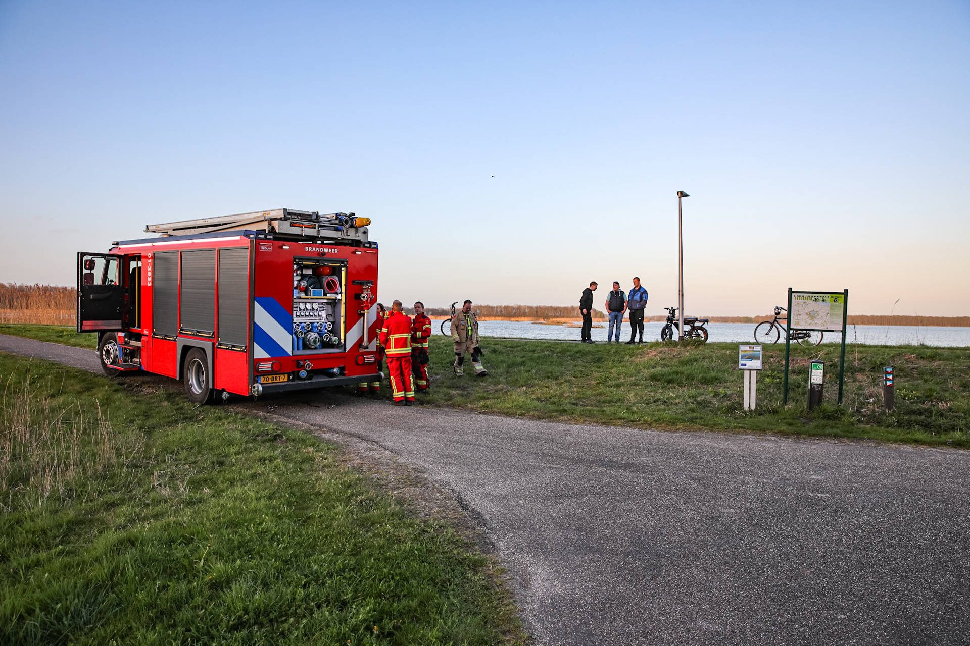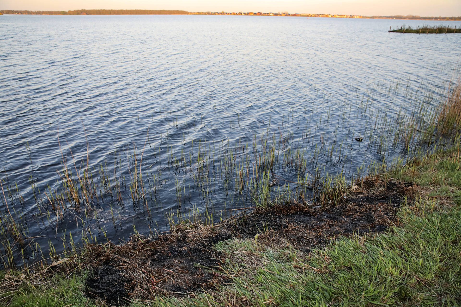Brandweer blust rietbrand langs meer